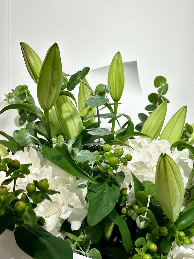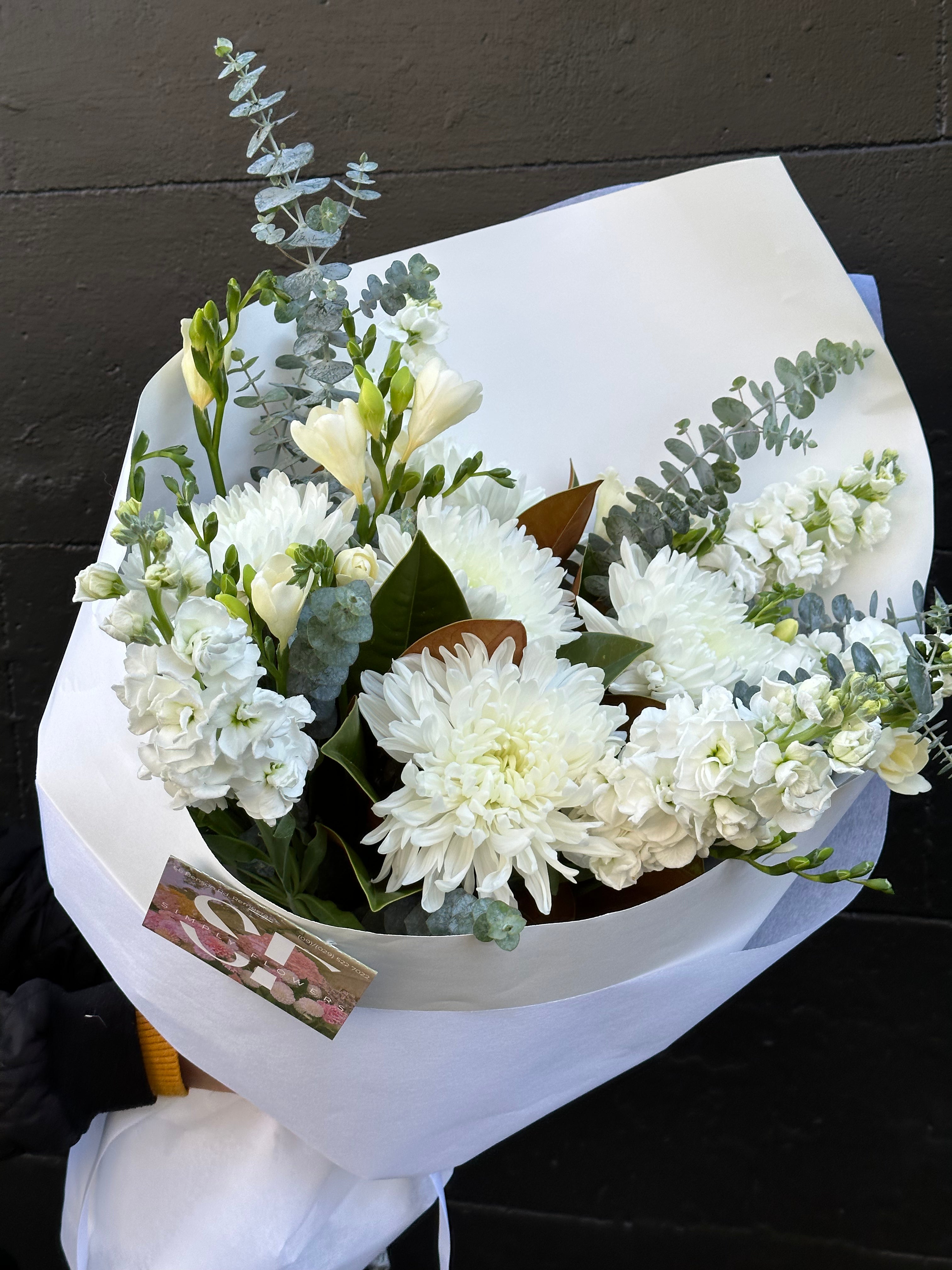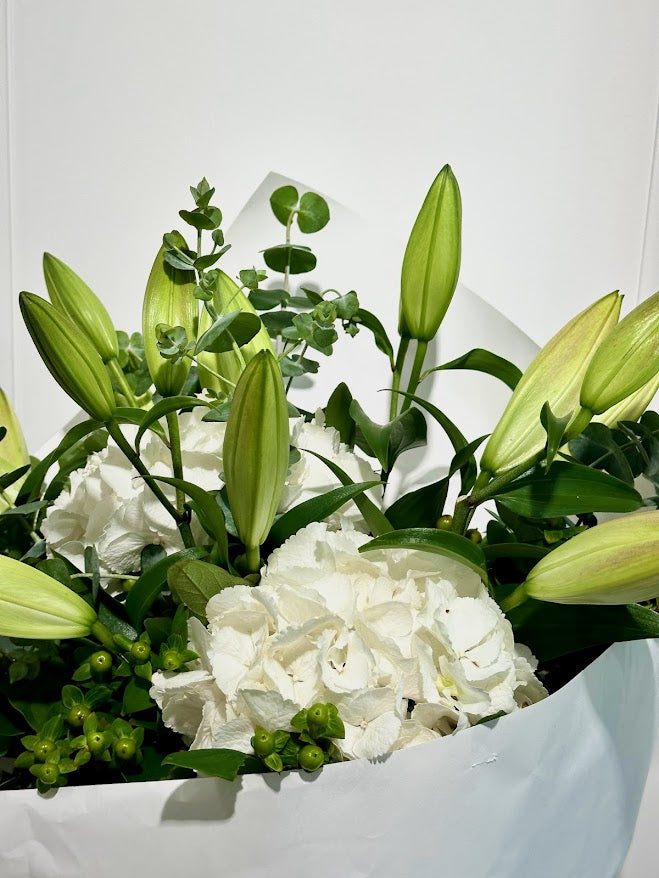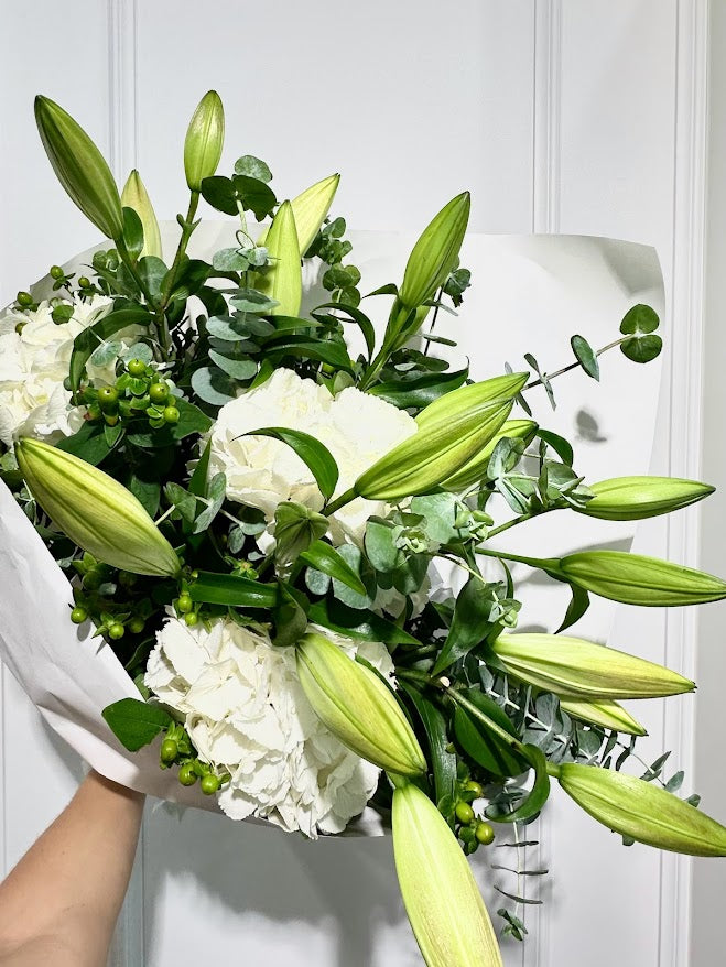 Introducing our timeless Classic Green and White Bouquet, suitable for all occasions! This stunning arrangement features a carefully curated selection of fresh white blooms and lush greenery, handcrafted by our expert florists into an elegant and sophisticated bouquet.