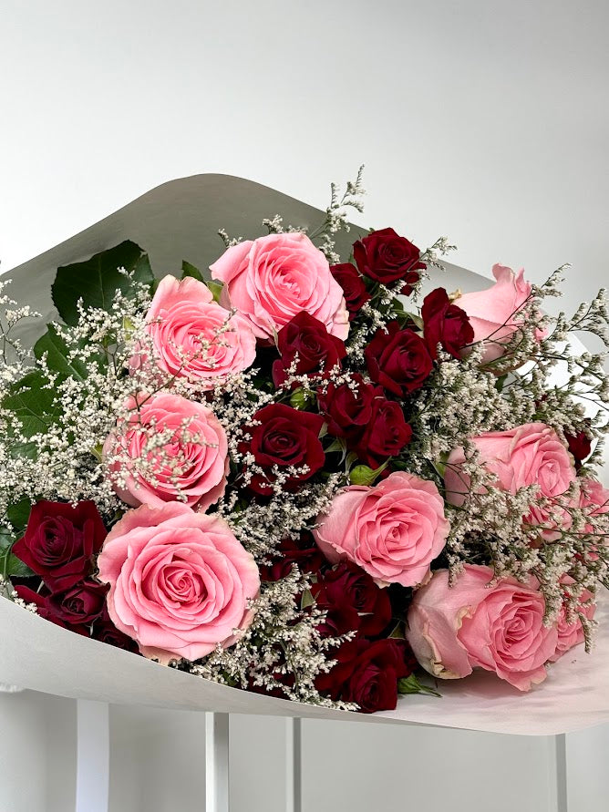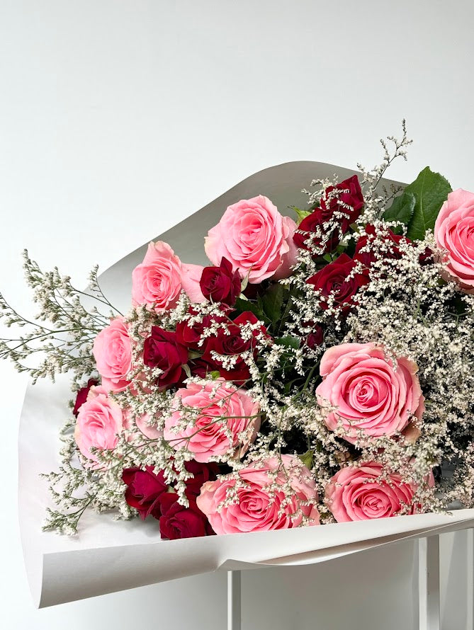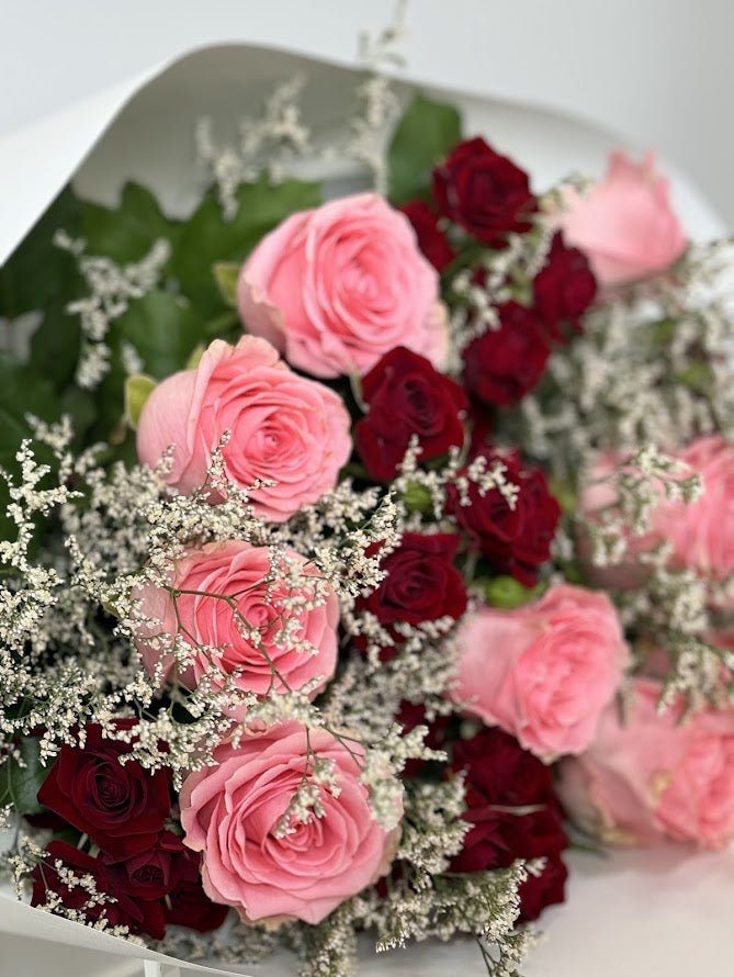 This enchanting bouquet features two stunning rose tones that beautifully complement each other, creating a harmonious blend of color. Soft, feathery misty flower filler adds a delicate, ethereal touch, enhancing the roses' natural beauty. A graceful arrangement that evokes a sense of calm and elegance, perfect for any heartfelt occasion.