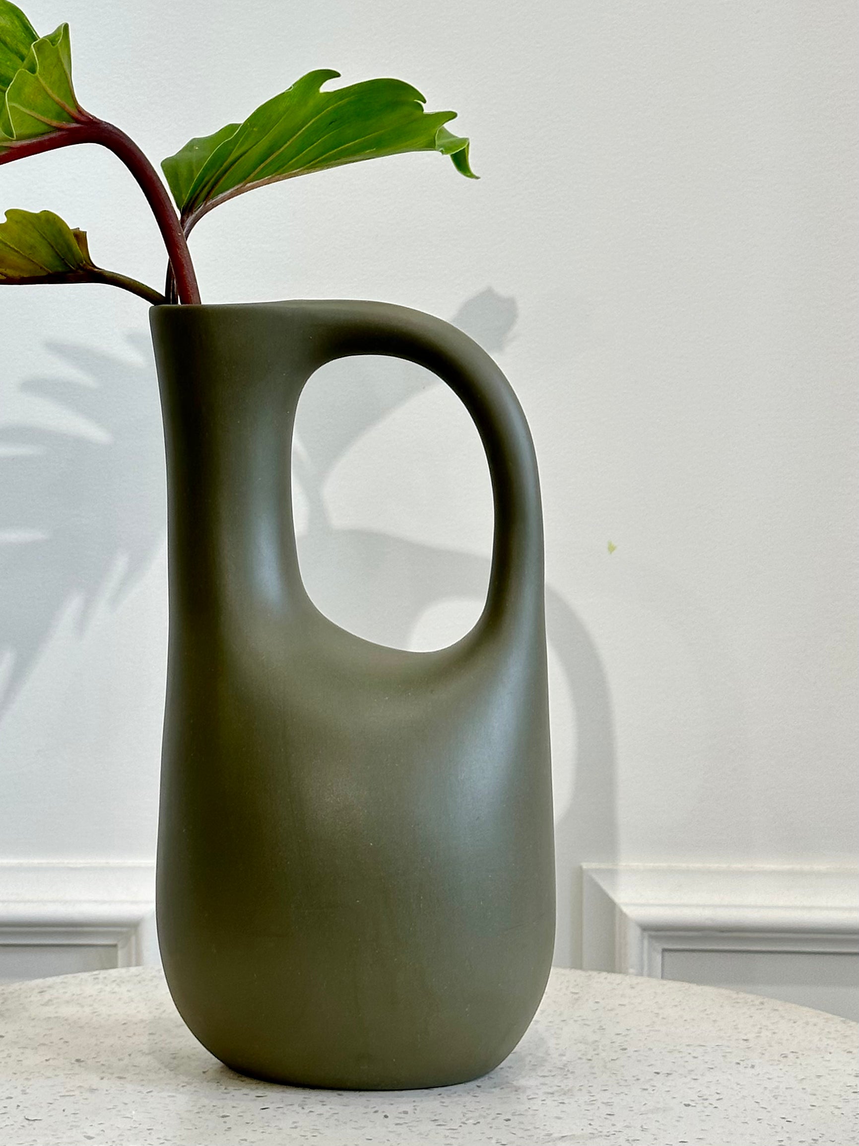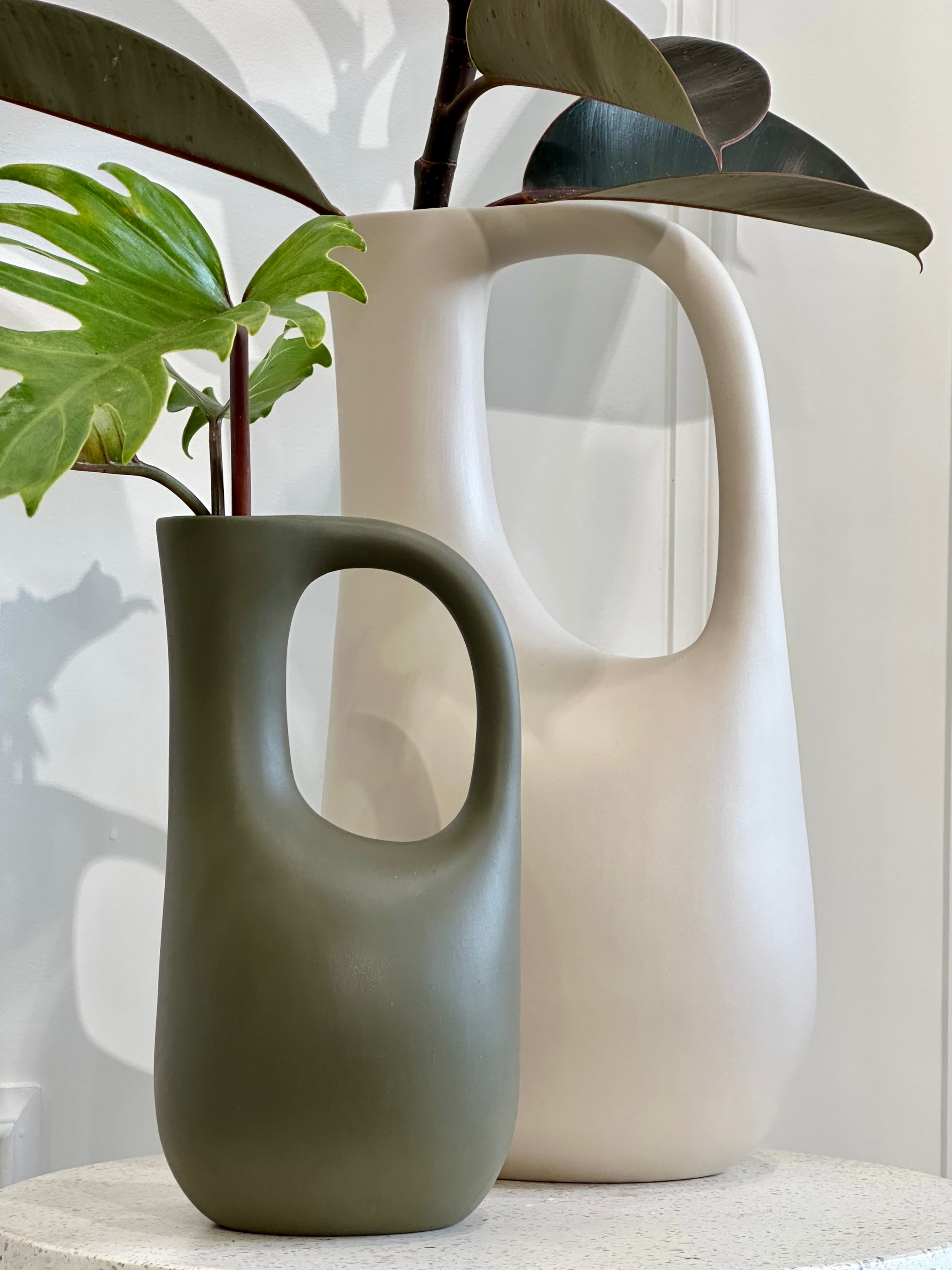 Our newest vase set in-store, our handmade ceramic Jug Vases are a stunning addition to your home. These organic shaped vases in Olive (Small) & Bone (Large) stand beautifully on a dining table, filled with any greenery or floral stems, or empty as a visual pieces on display.