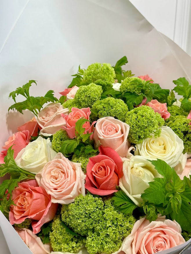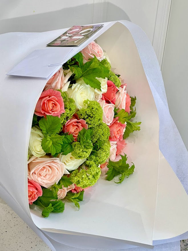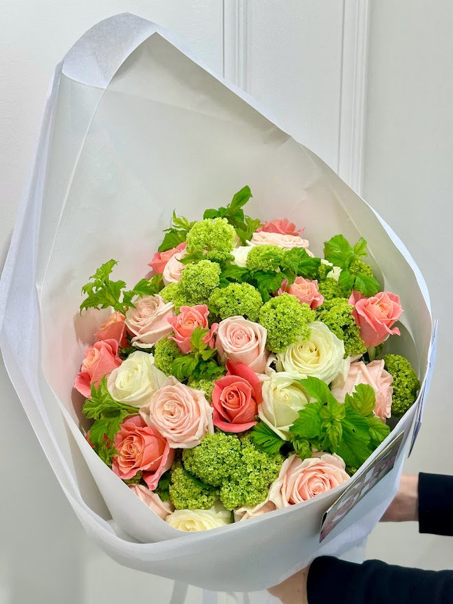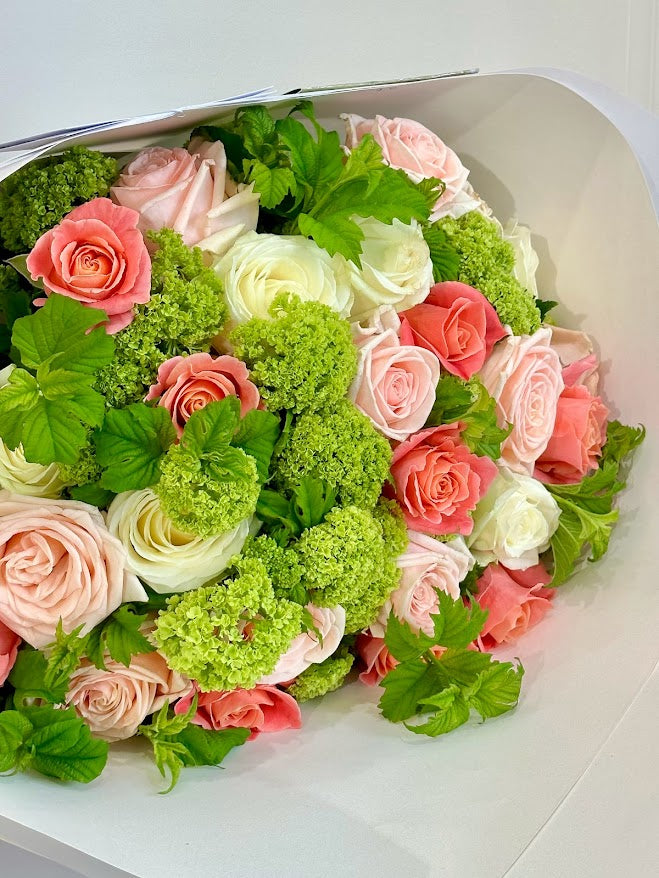 A premium Bouquet with 3 bunches of roses beautifully arranged amongst fresh greenery stems of the day.