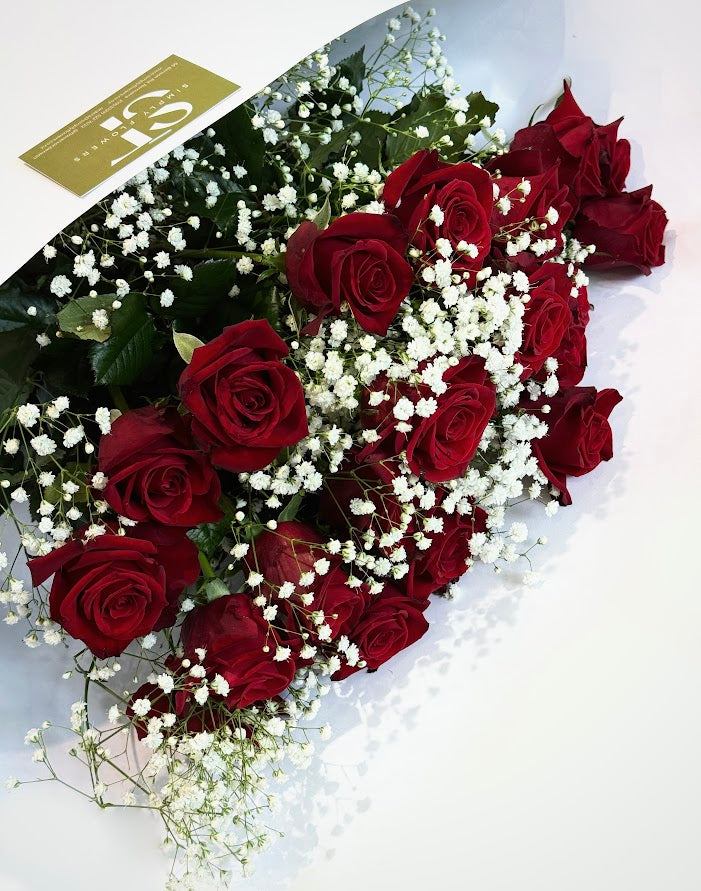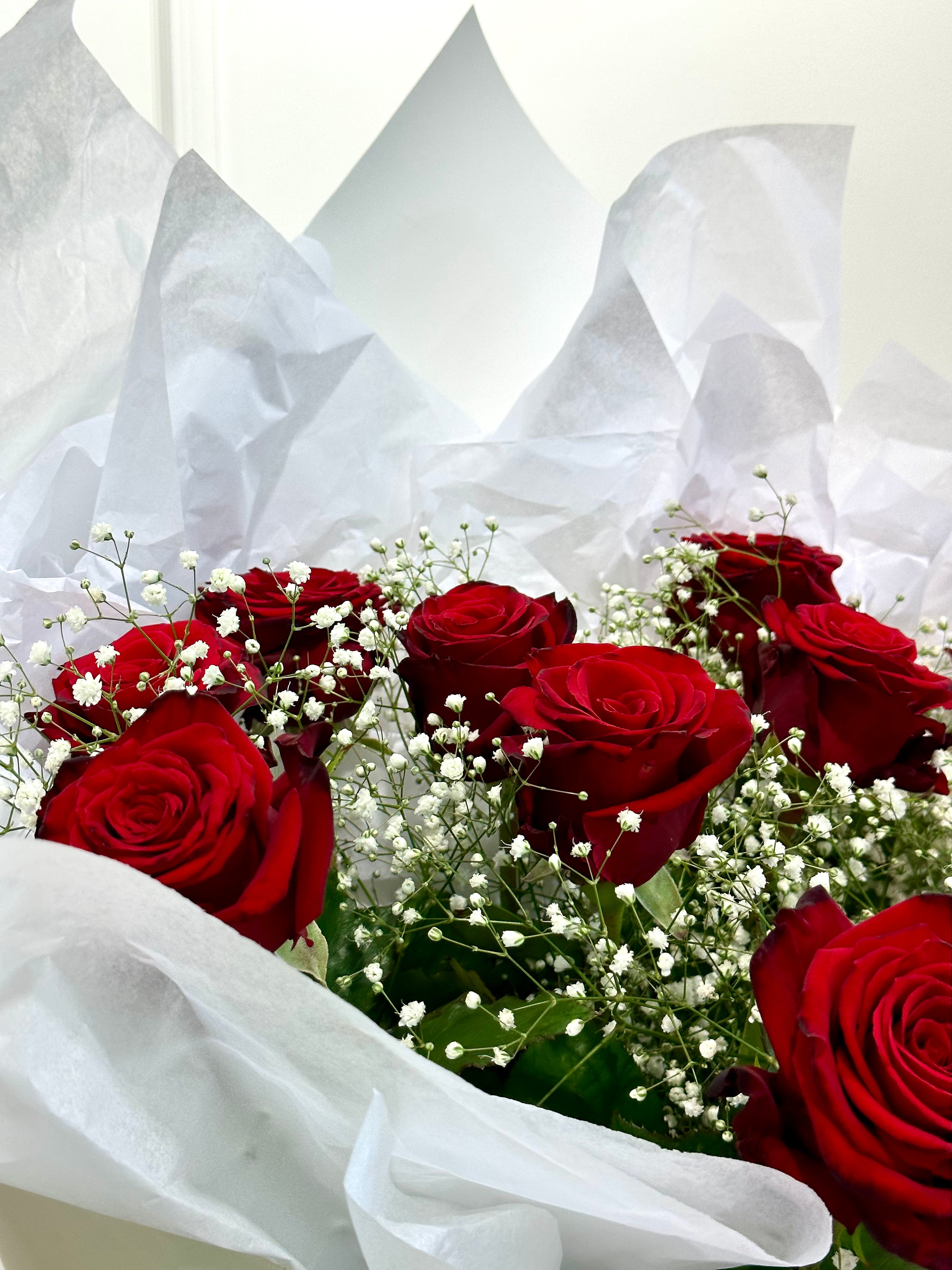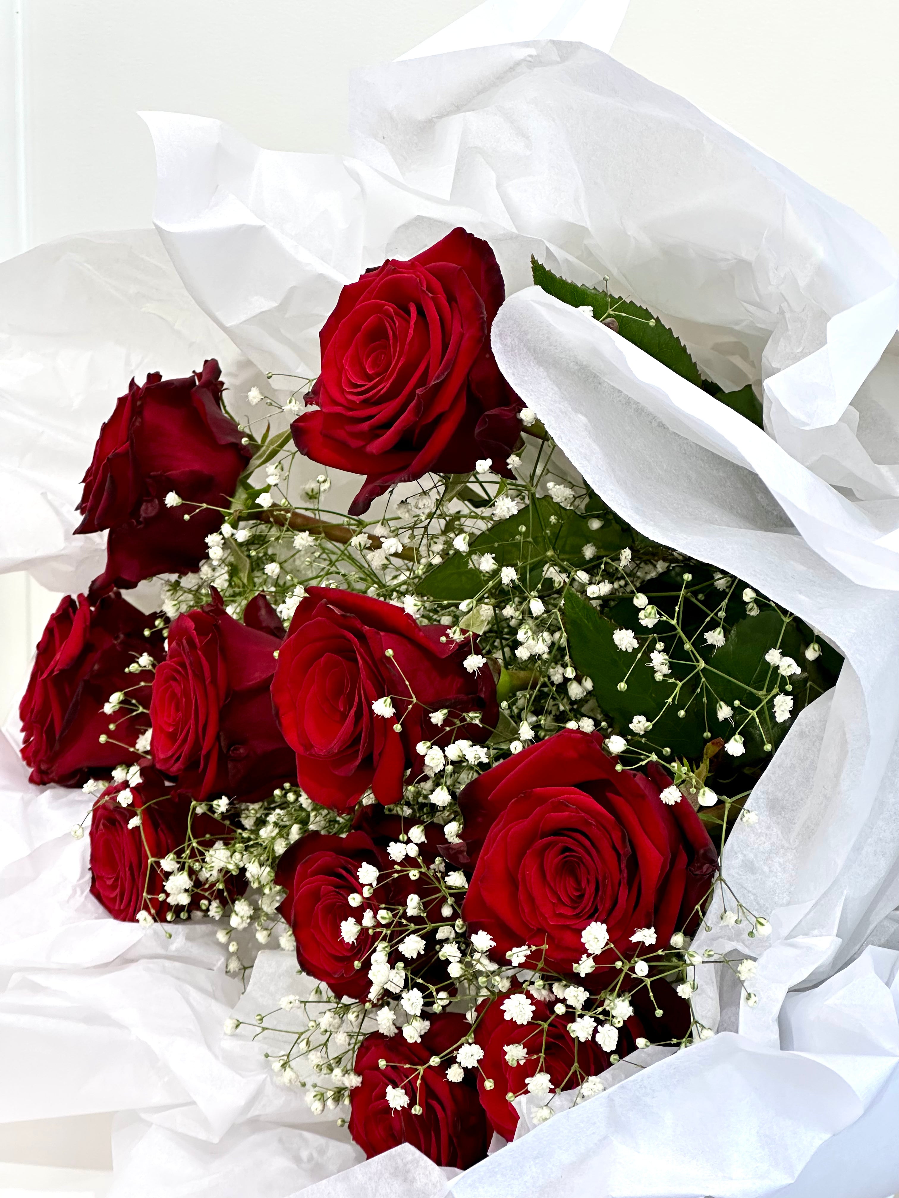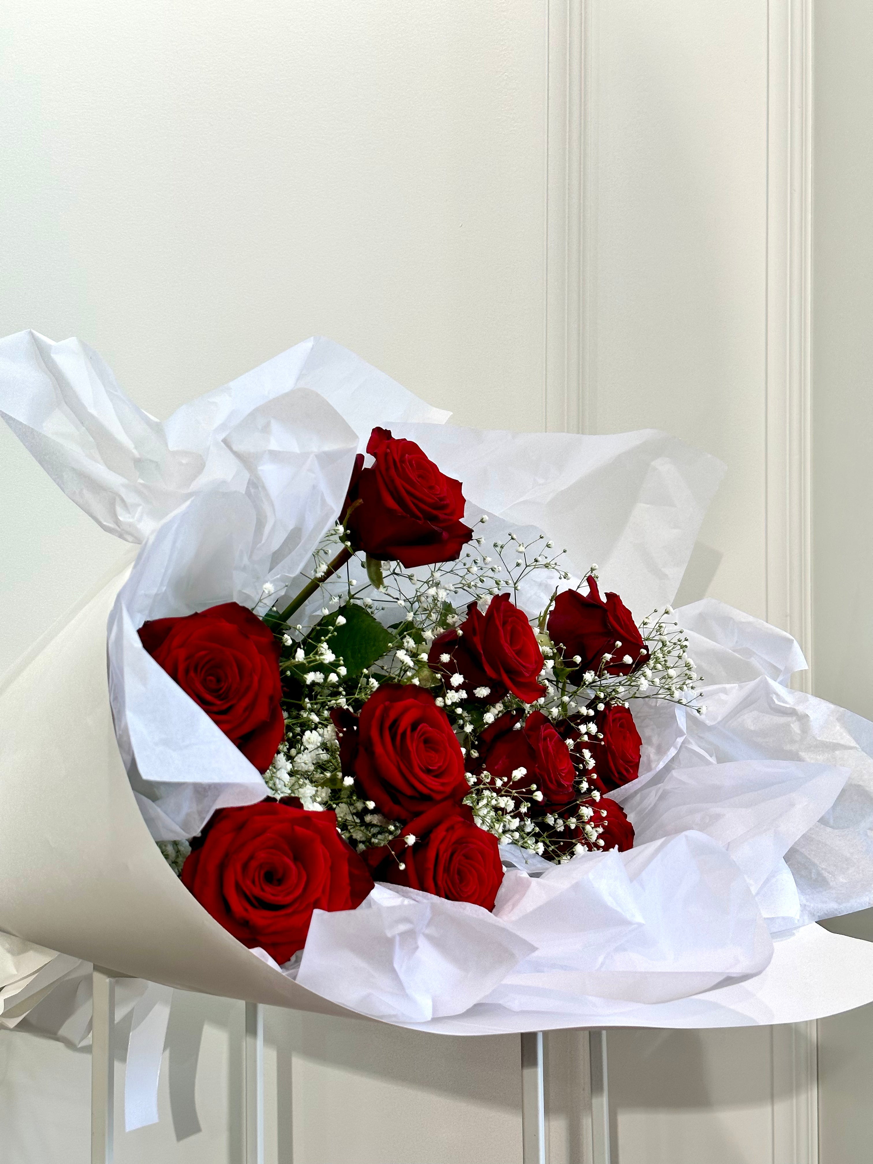 Red Romance – A classic beauty that speaks volumes. This stunning bouquet of 10 vibrant Red Roses (or make it a Grand gesture and double it) & timeless Gypsophila is the perfect way to express your love, no matter the occasion.