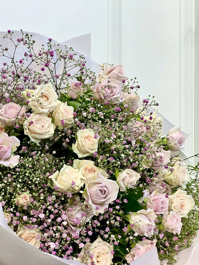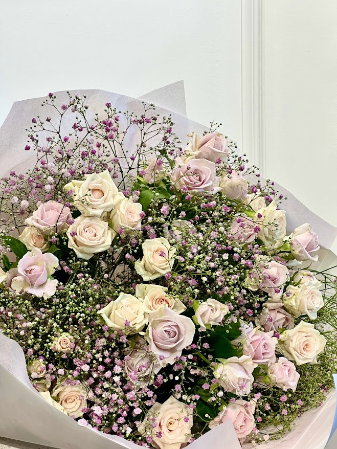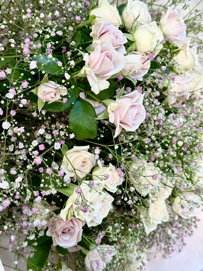 A mixture of pastel Spray Roses surrounded by Gypsophila.