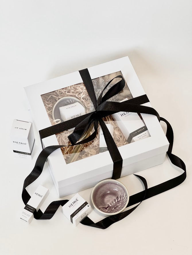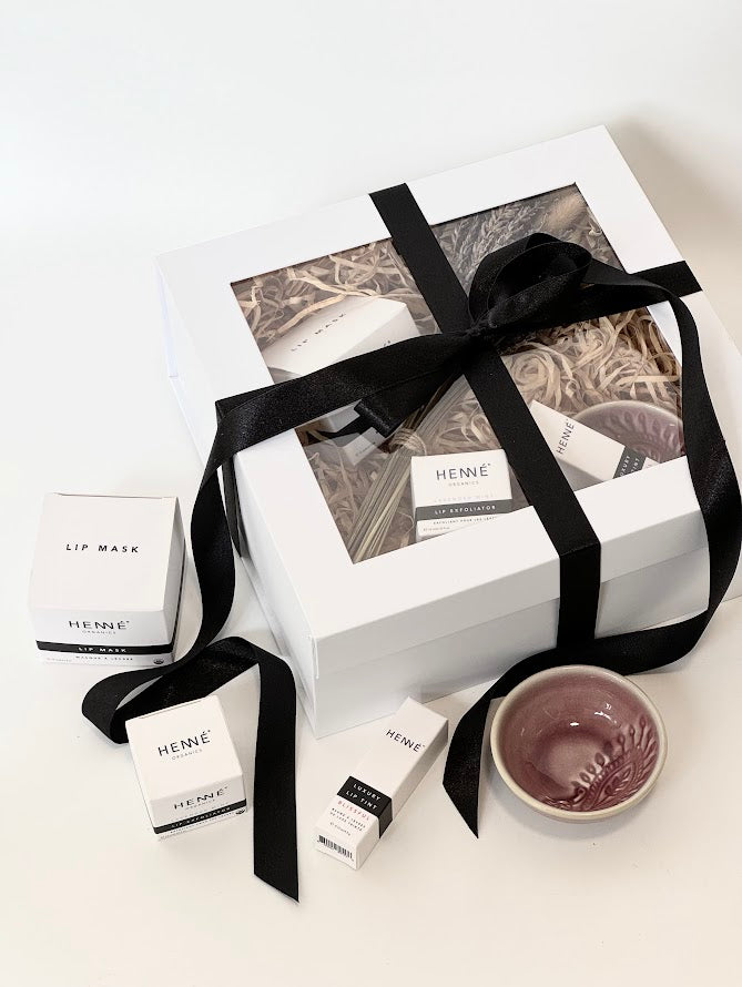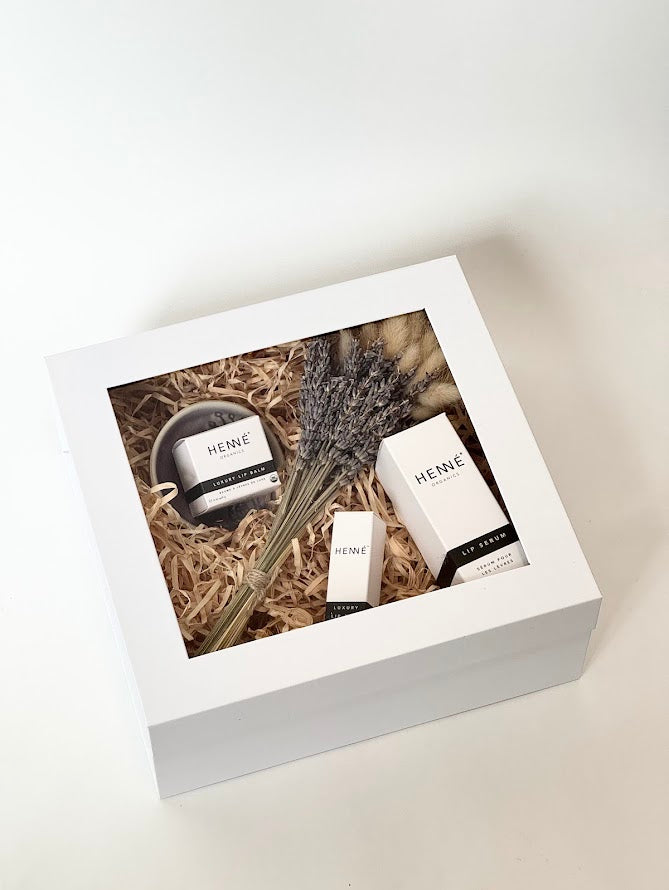 Each set comes with 3 different Lip Care products, a Ceramic Ring Dish, & Aromatic Dried Lavender & Bunny Tail Bunch. Comes beautifully boxed & Bowed, with our MUM card.