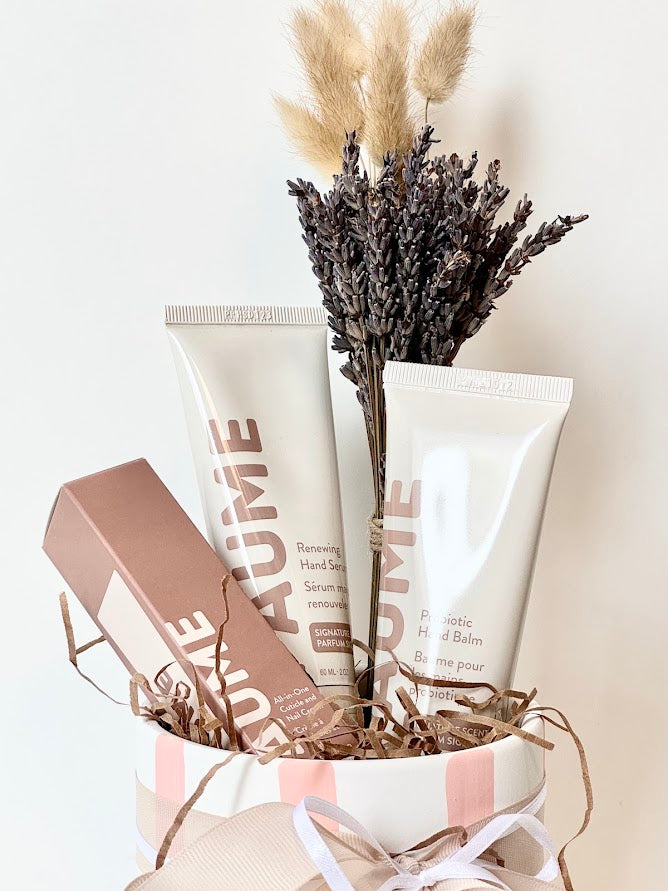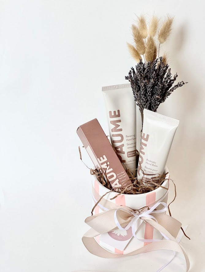 Comes with a perfect trio of Renewing Hand Serum, Probiotic Hand Balm & All-in-One Cuticle and Nail Cream. As well as an aromatic dried Lavender & Bunny bunch all set off in our hand painted pink stripe pots!