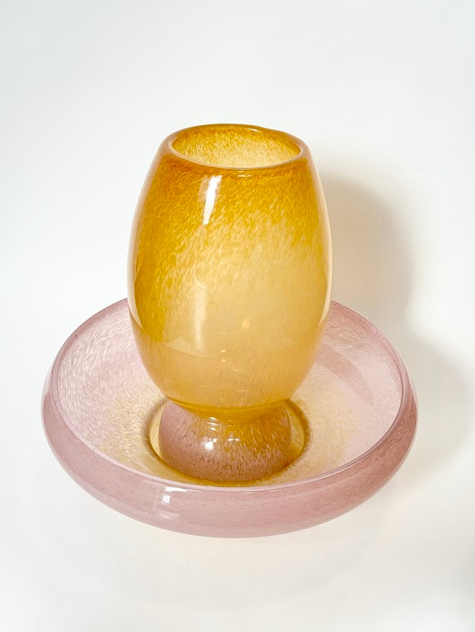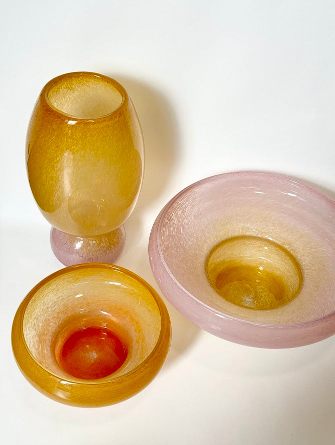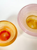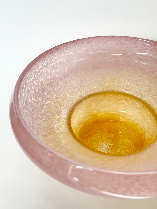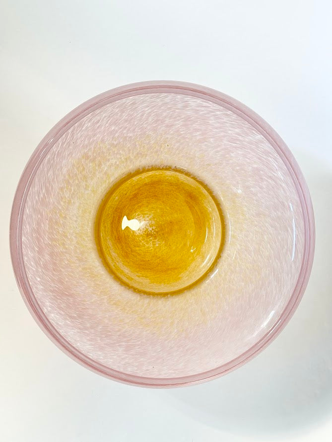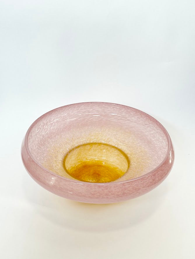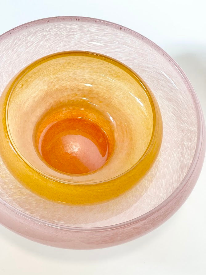 Hand-blown glass bowl made from colored glass with a unique, modern shape that catches the eye. The bowl has a simple but eye-catching shape with a narrow bottom and a wide, open top. The soft, rounded edges create an alluring look, while the elegant colors blend beautifully. The weight of the thick glass gives a strong and durable expression to the bowl. The bowl is beautiful on its own, but can also be used as a fruit bowl or to create floral decorations for example.