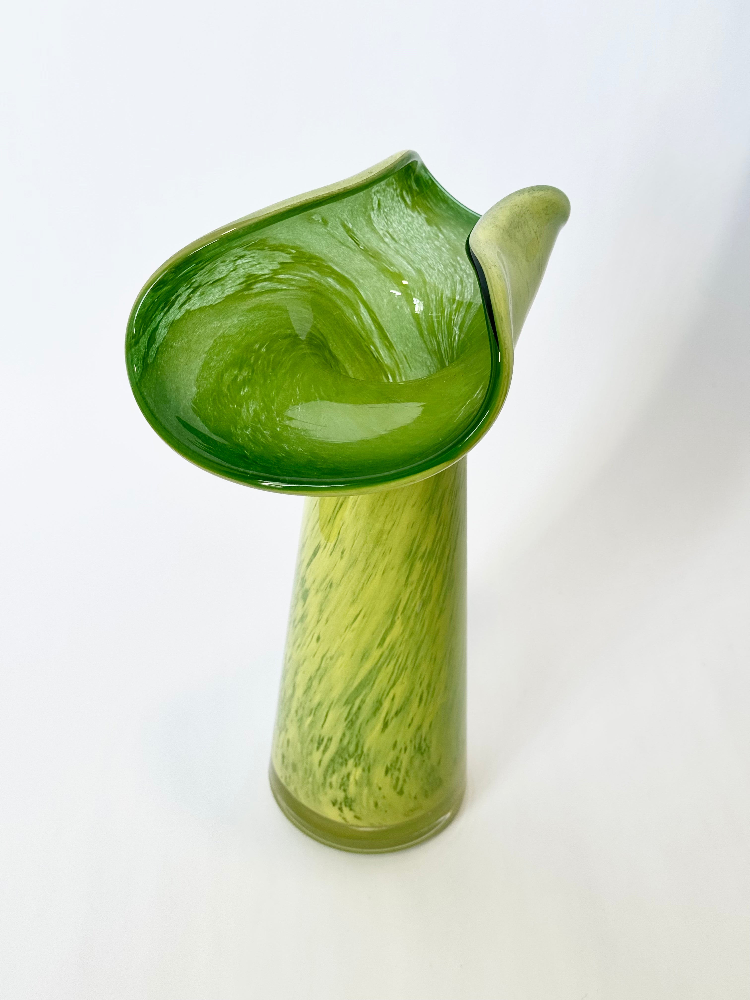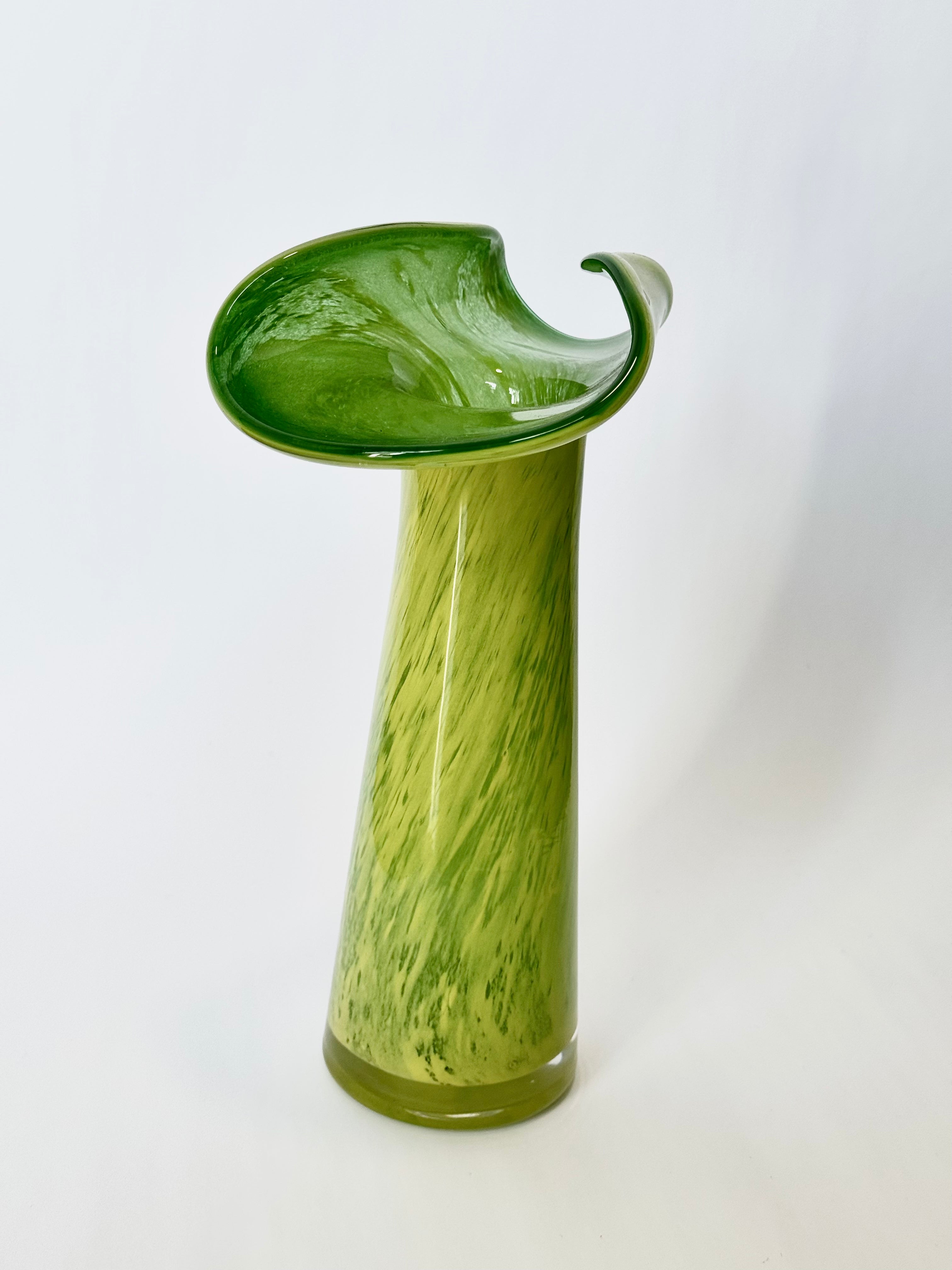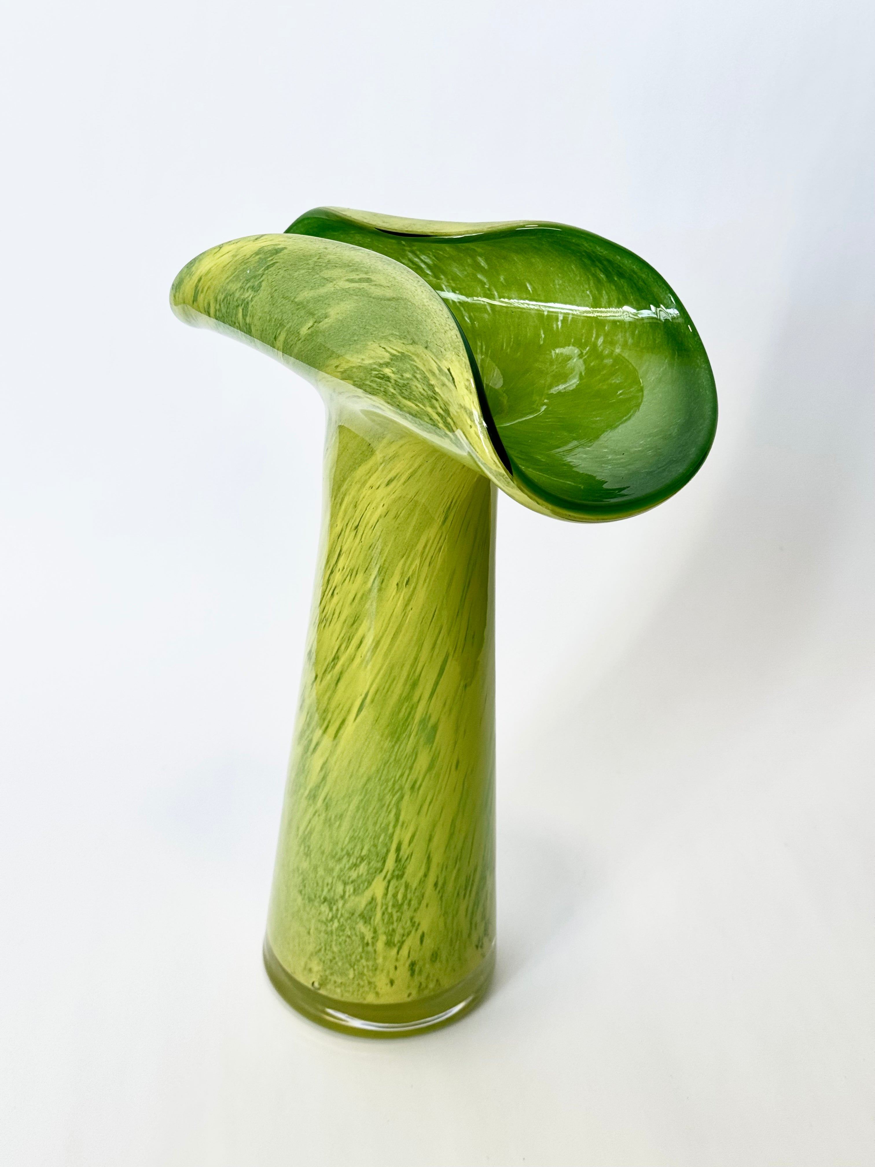 Inspired by nature and shaped by hand, this striking green glass vase is a bold yet elegant piece of functional art. Individually mouth-blown, it features a graceful flared top that curves like a blooming flower, paired with soft marbling in rich, leafy green tones.