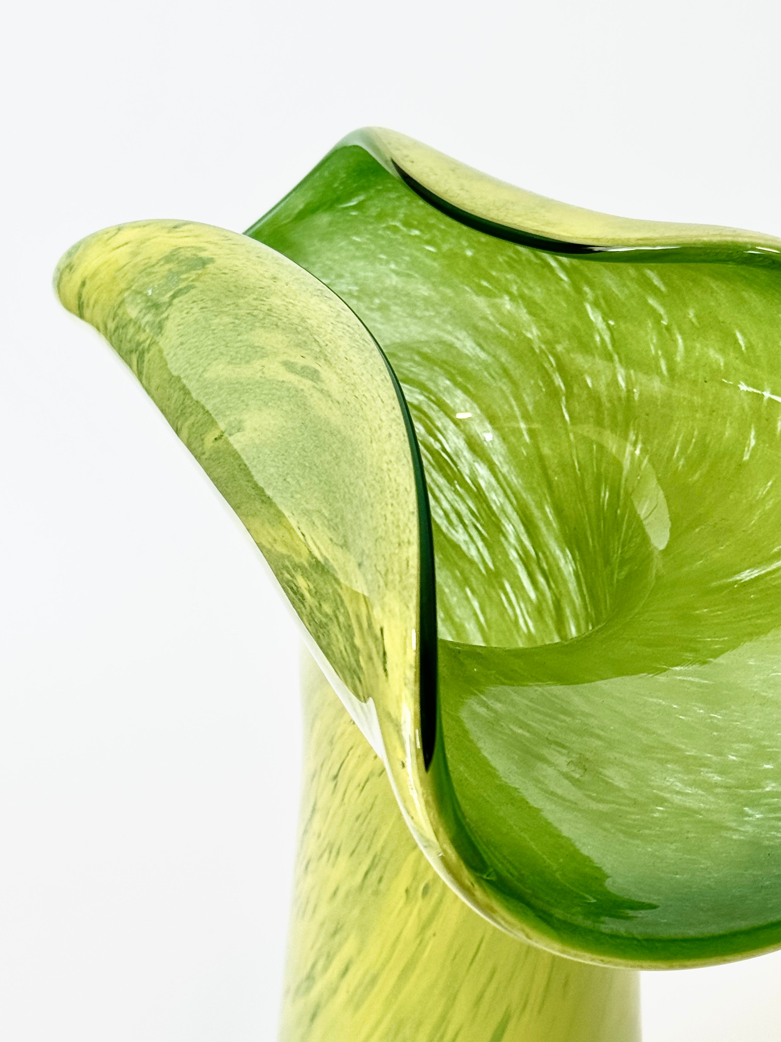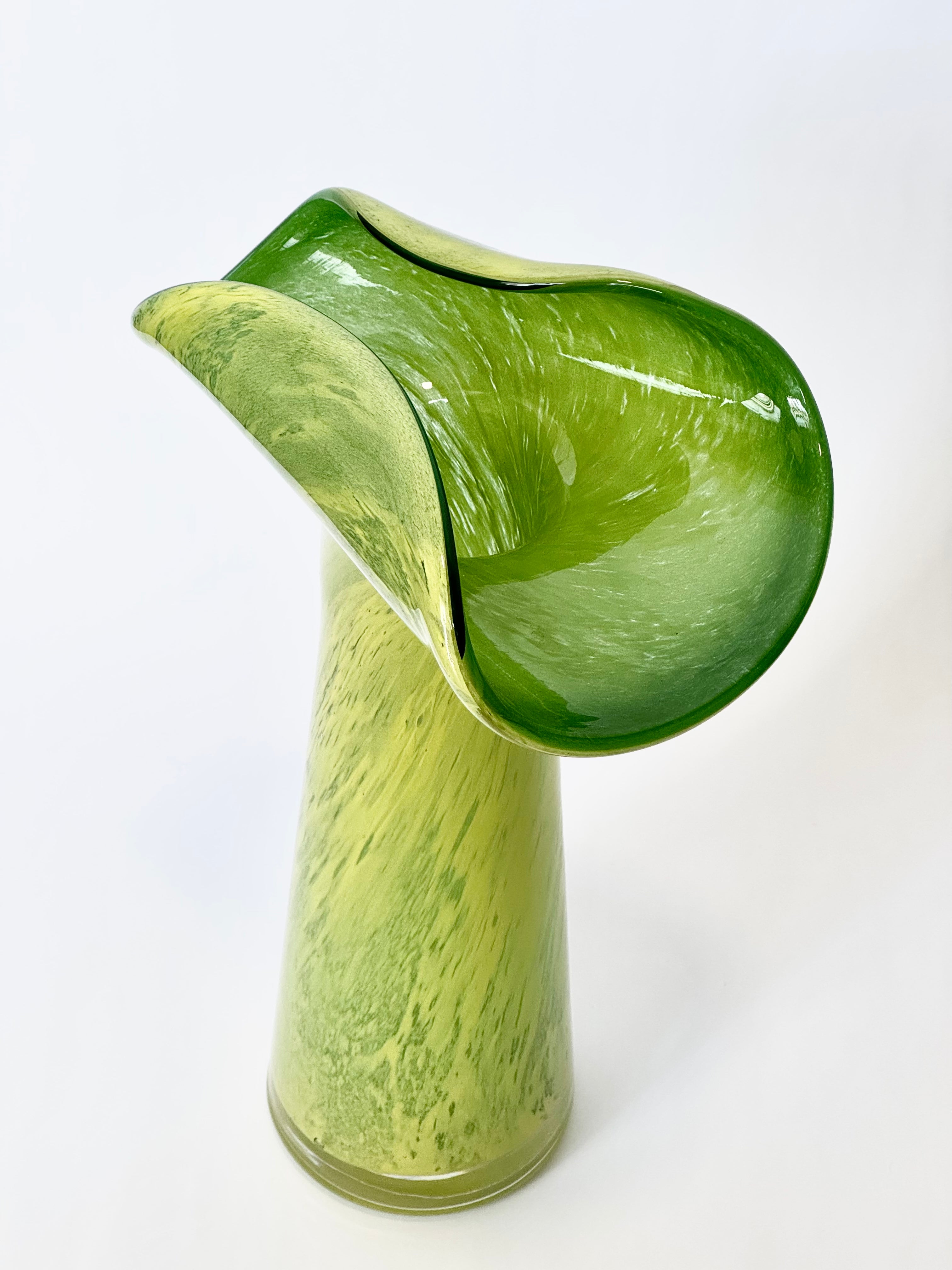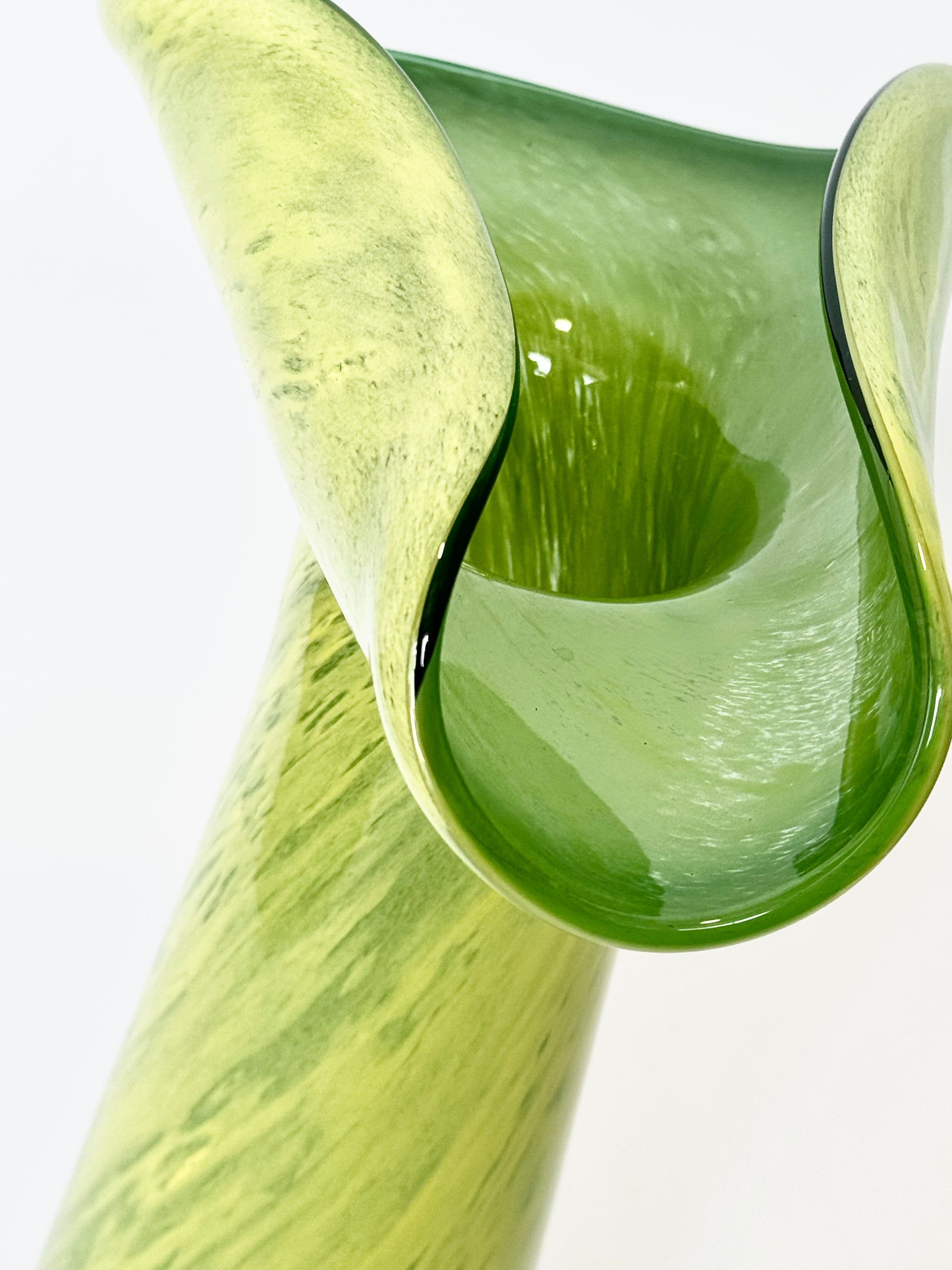 Inspired by nature and shaped by hand, this striking green glass vase is a bold yet elegant piece of functional art. Individually mouth-blown, it features a graceful flared top that curves like a blooming flower, paired with soft marbling in rich, leafy green tones.