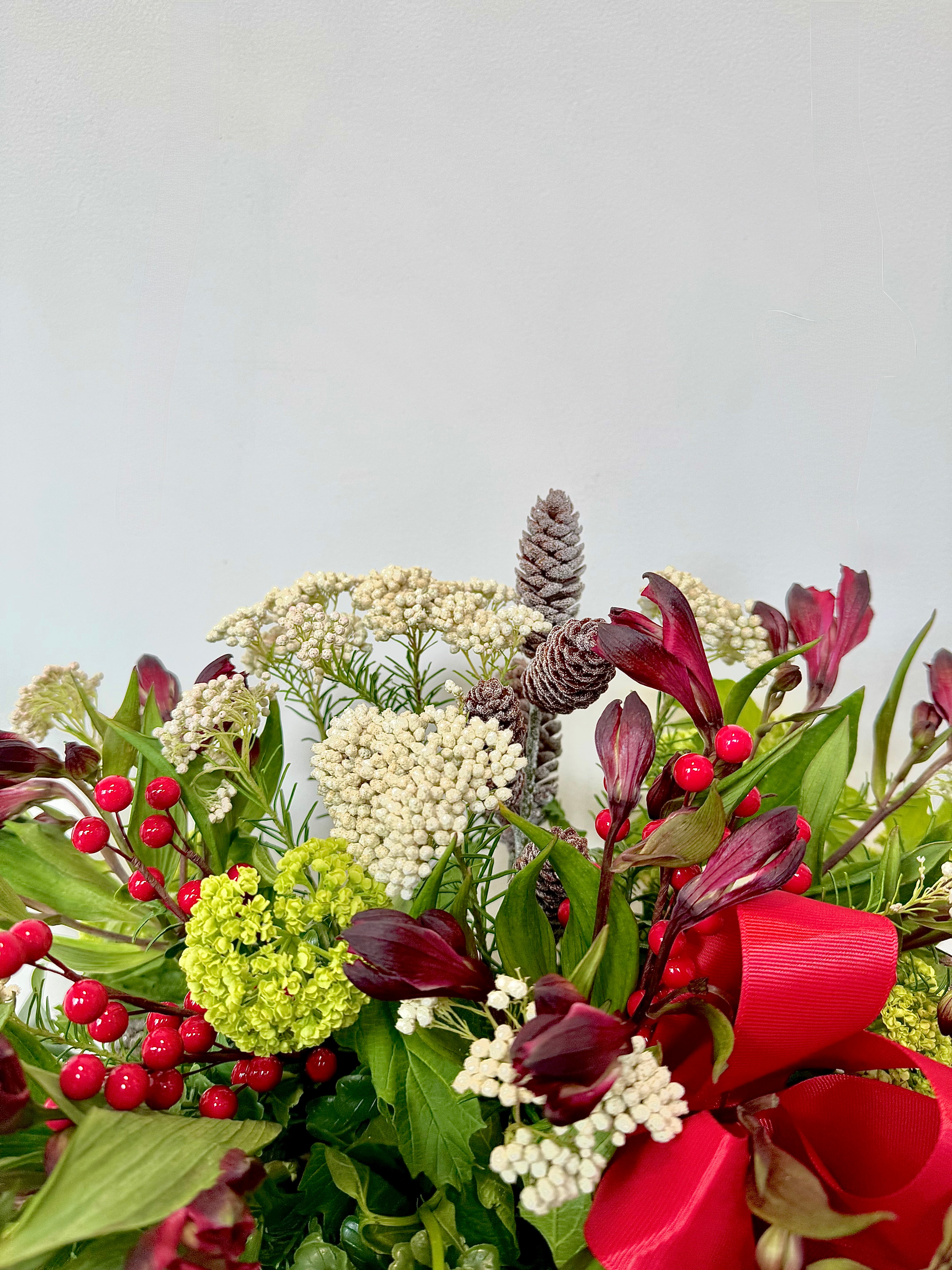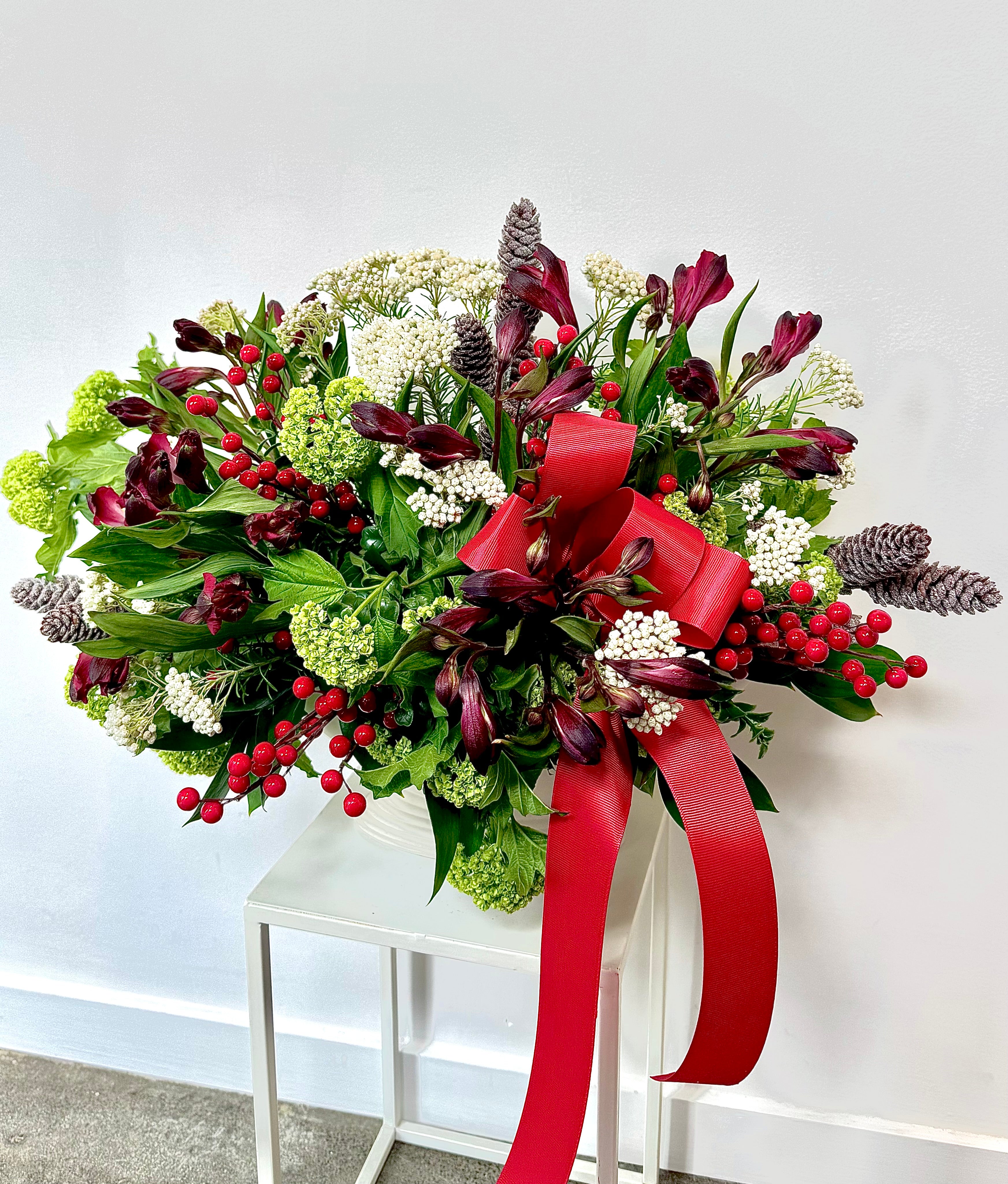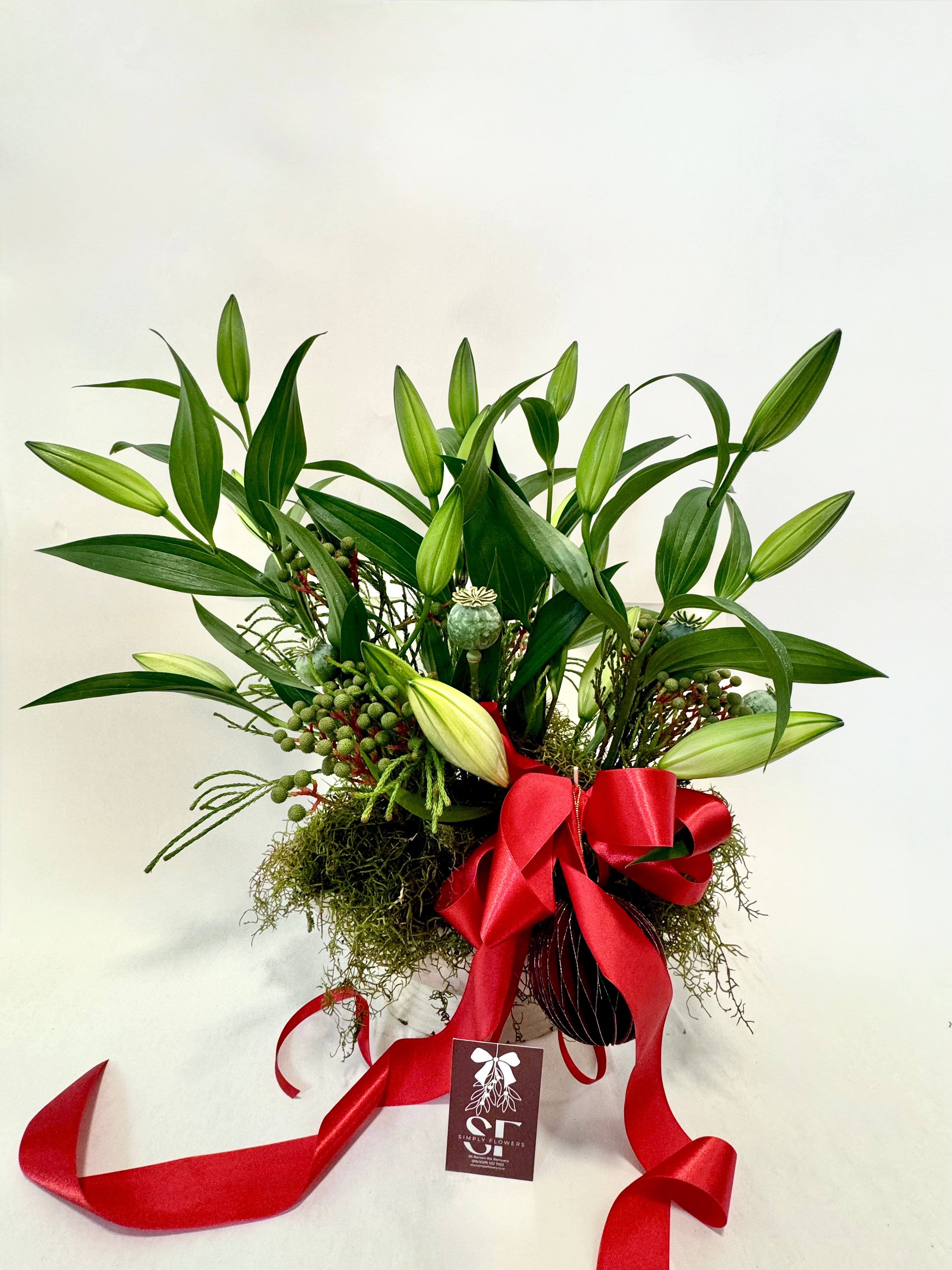 Bring the spirit of the season to your table with our beautifully crafted Christmas Vase Arrangement. Featuring pinecones, lush greenery, red berries, and festive bows, this arrangement adds warmth and charm to any holiday setting OR a white lily option with our exclusive opium buds.