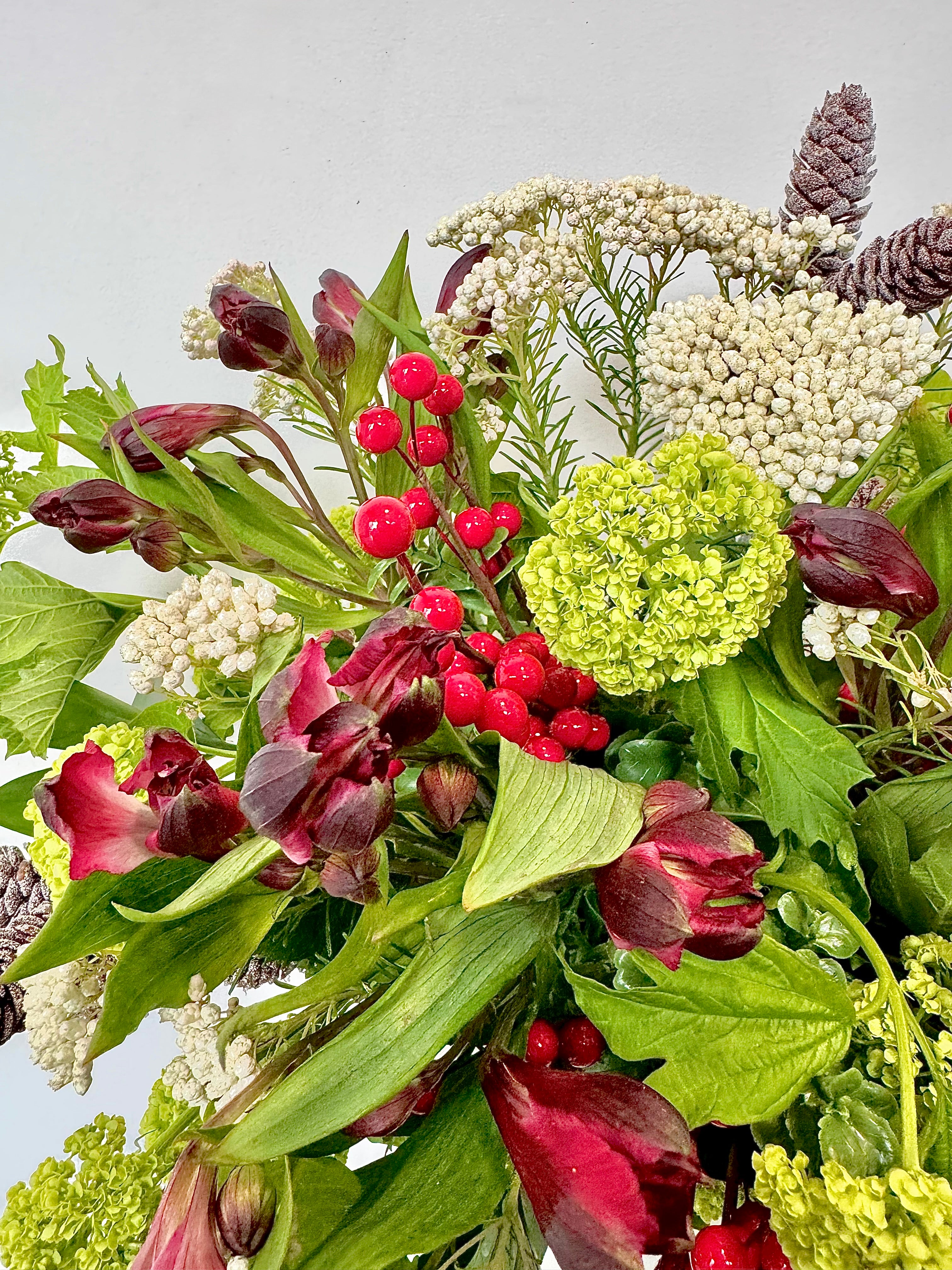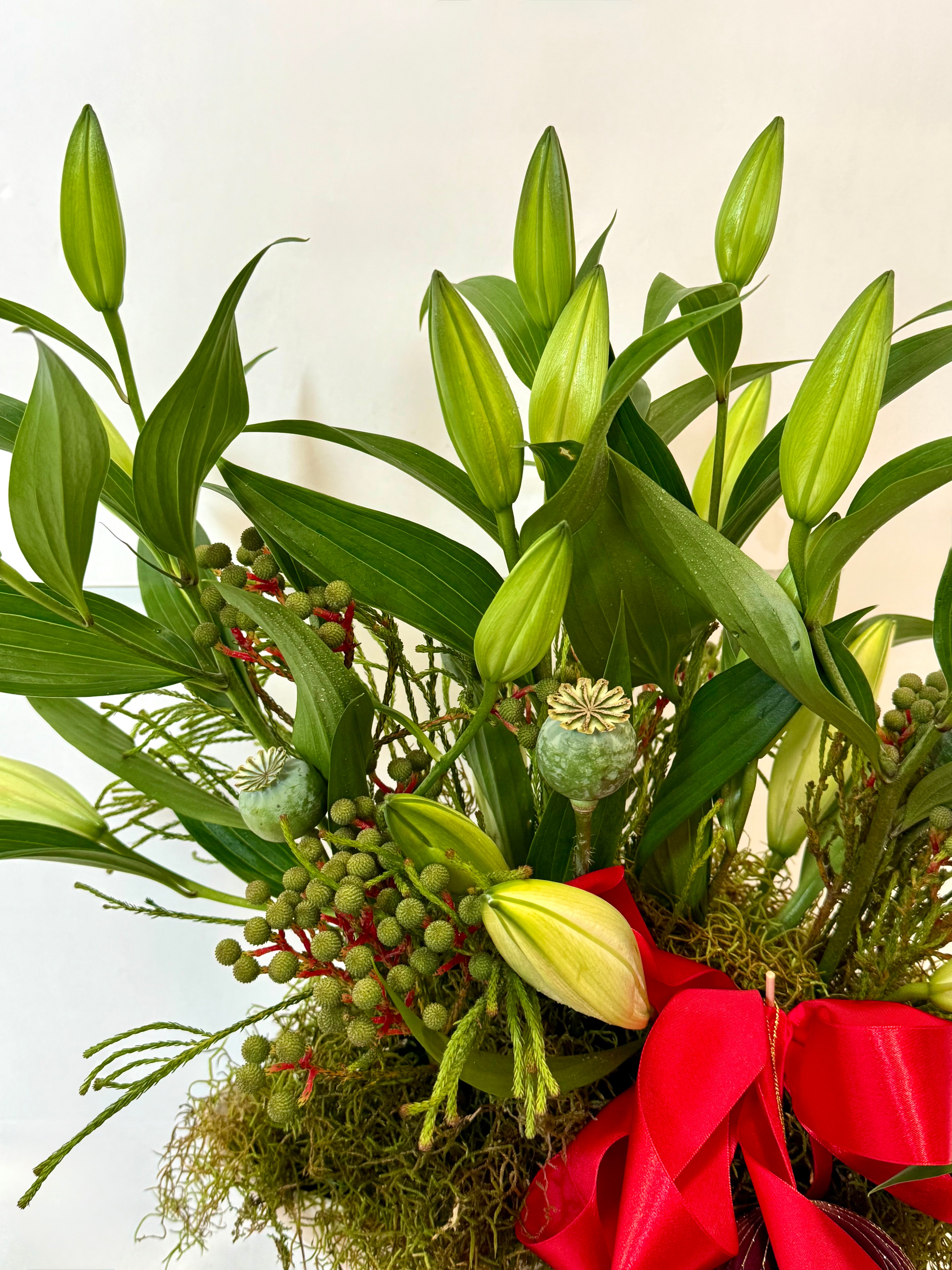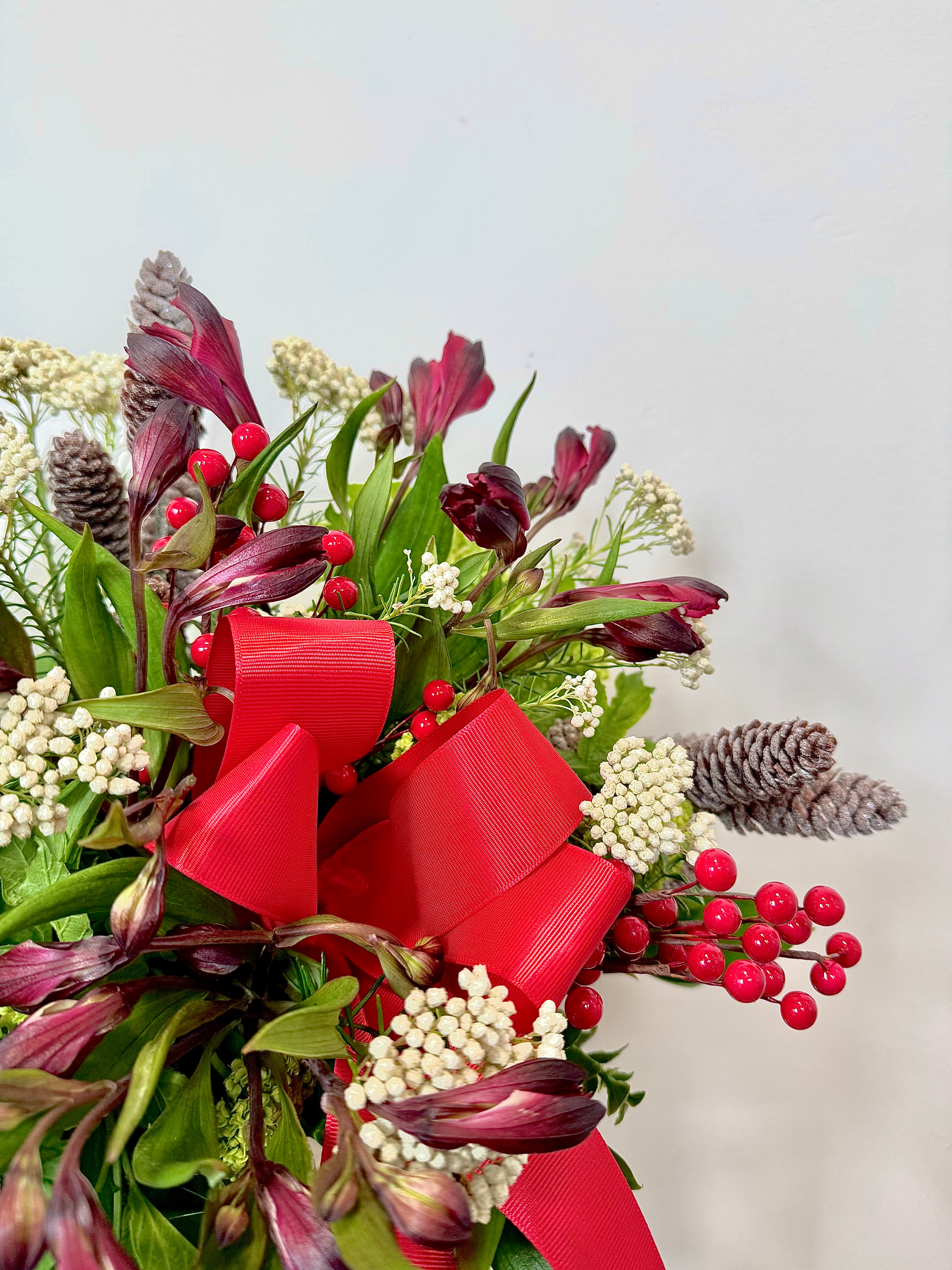 Bring the spirit of the season to your table with our beautifully crafted Christmas Vase Arrangement. Featuring pinecones, lush greenery, red berries, and festive bows, this arrangement adds warmth and charm to any holiday setting OR a white lily option with our exclusive opium buds.