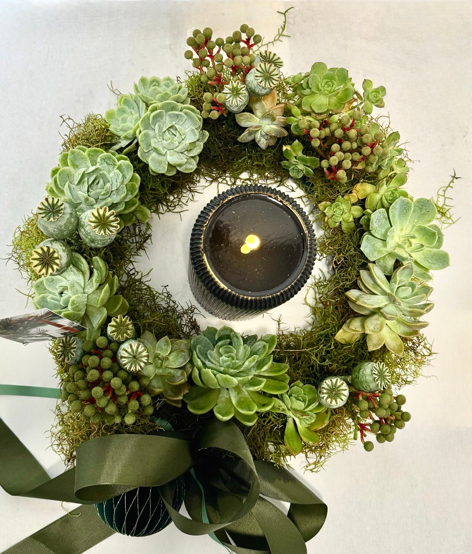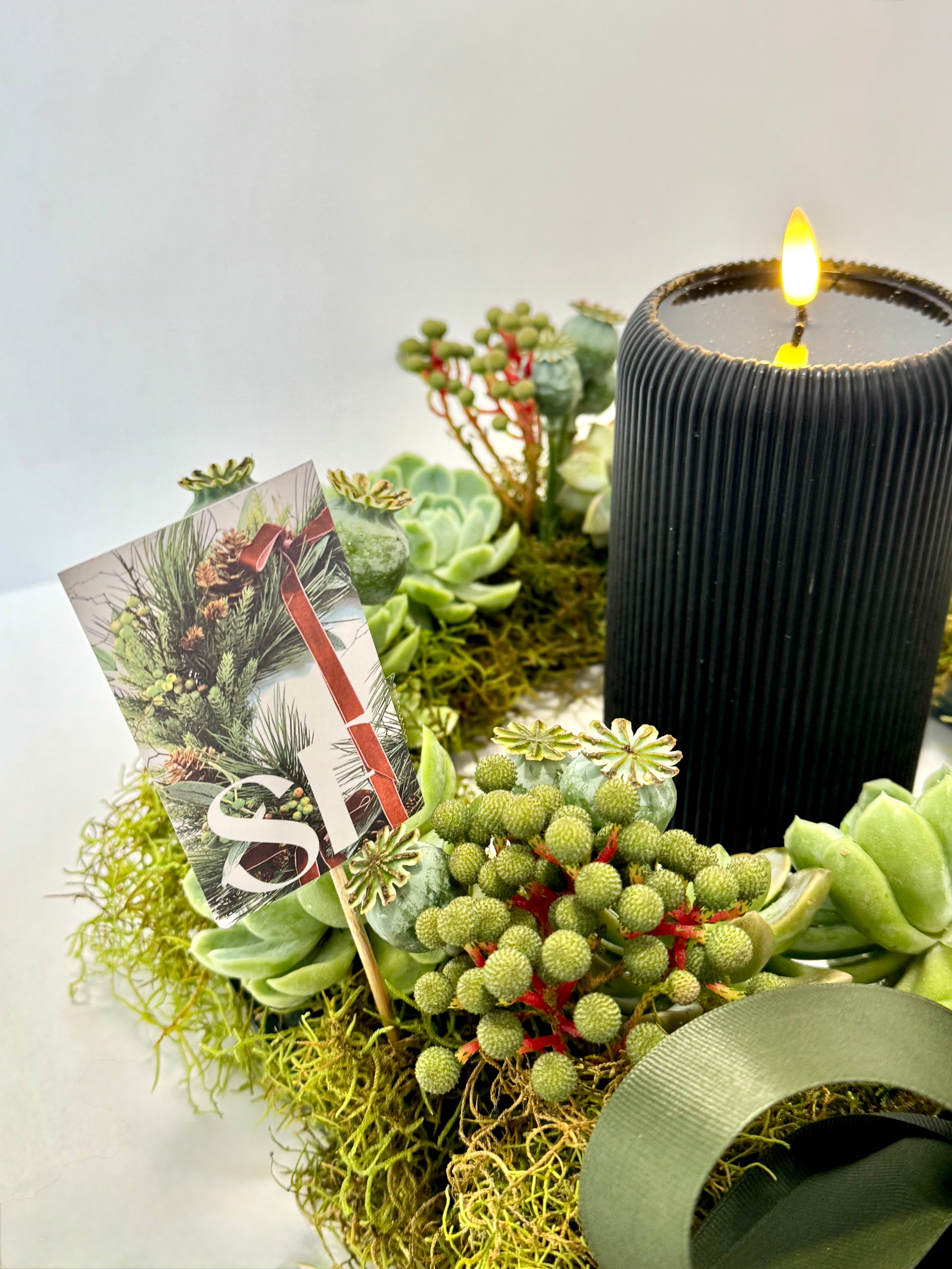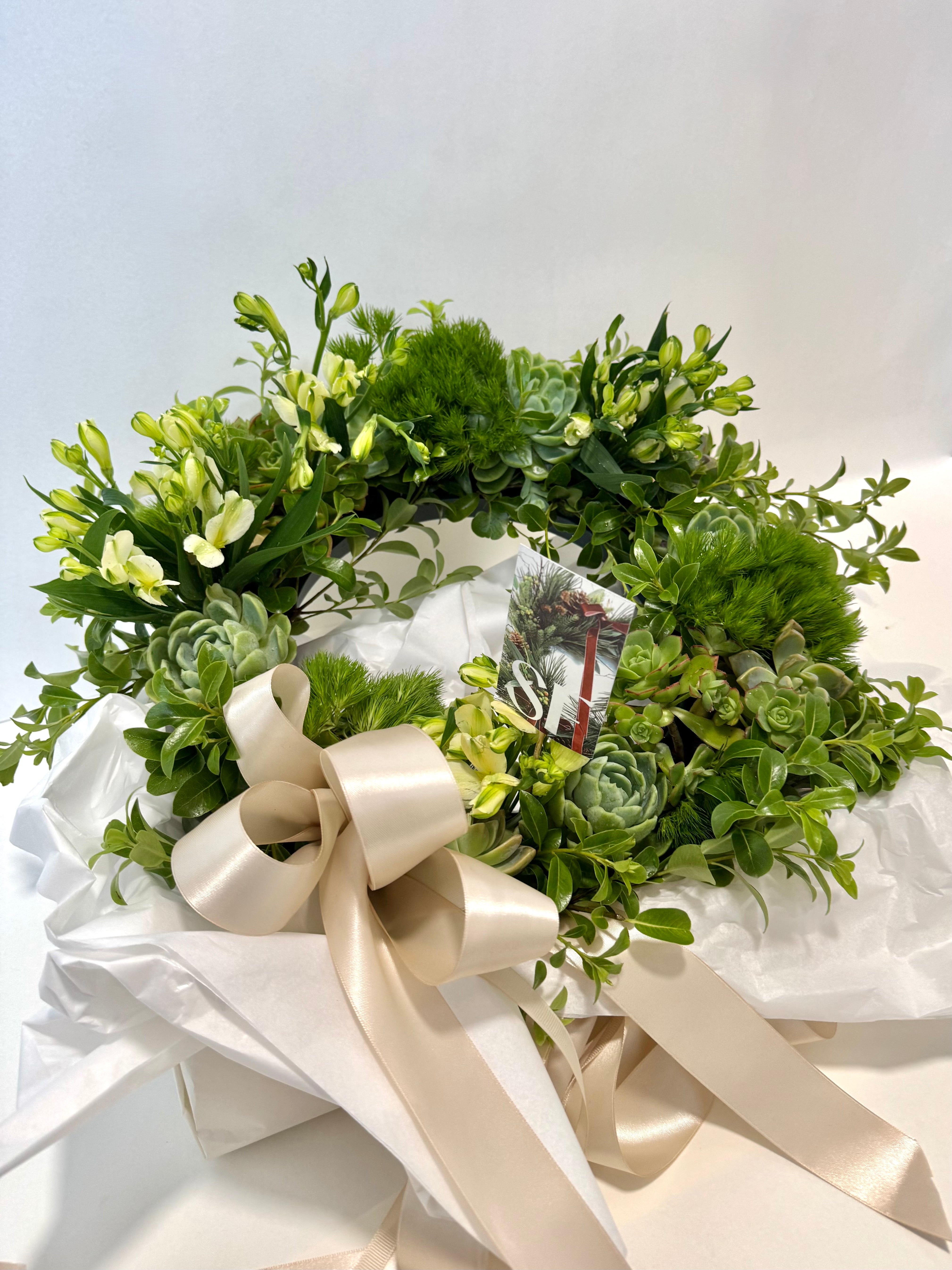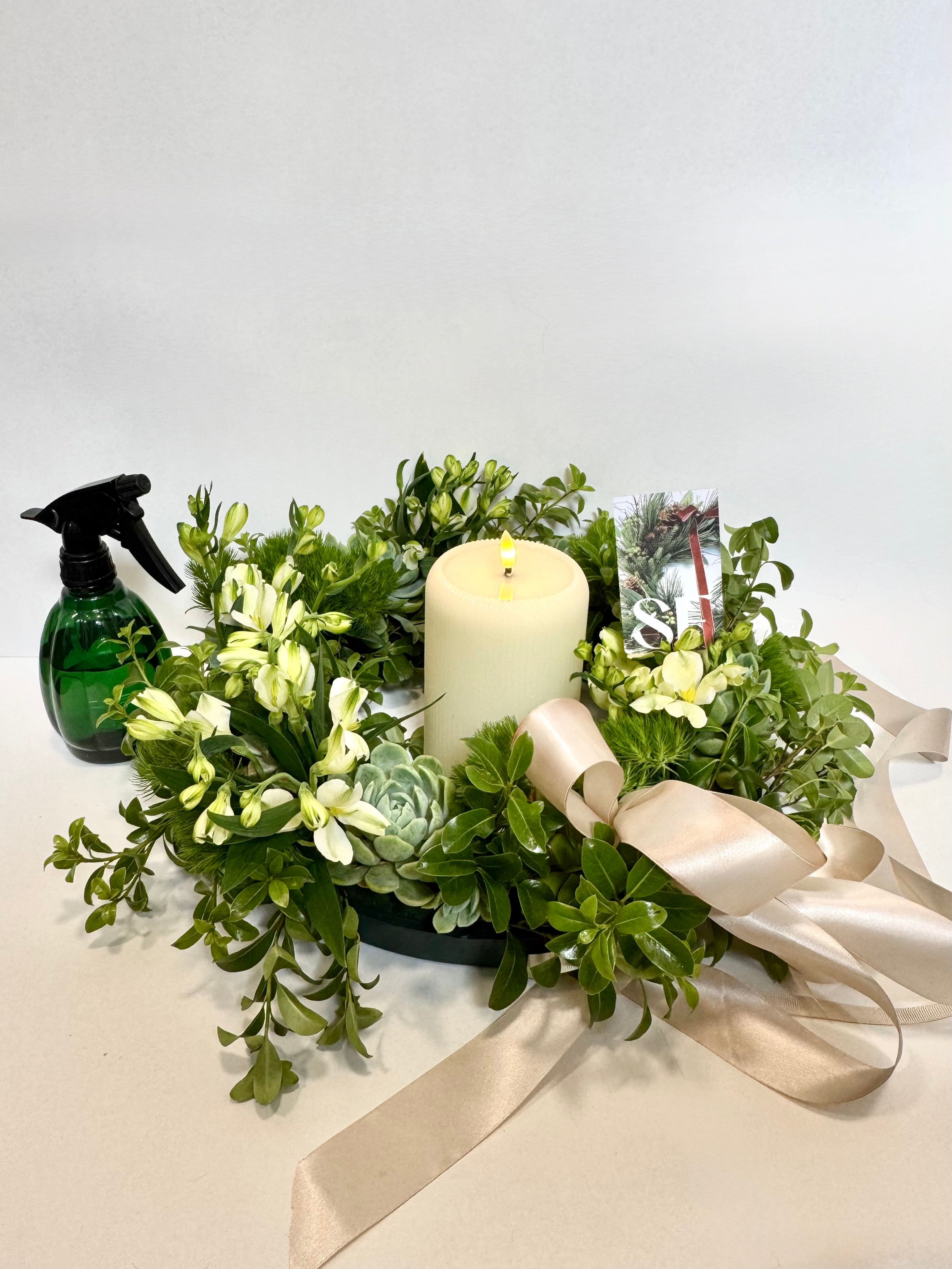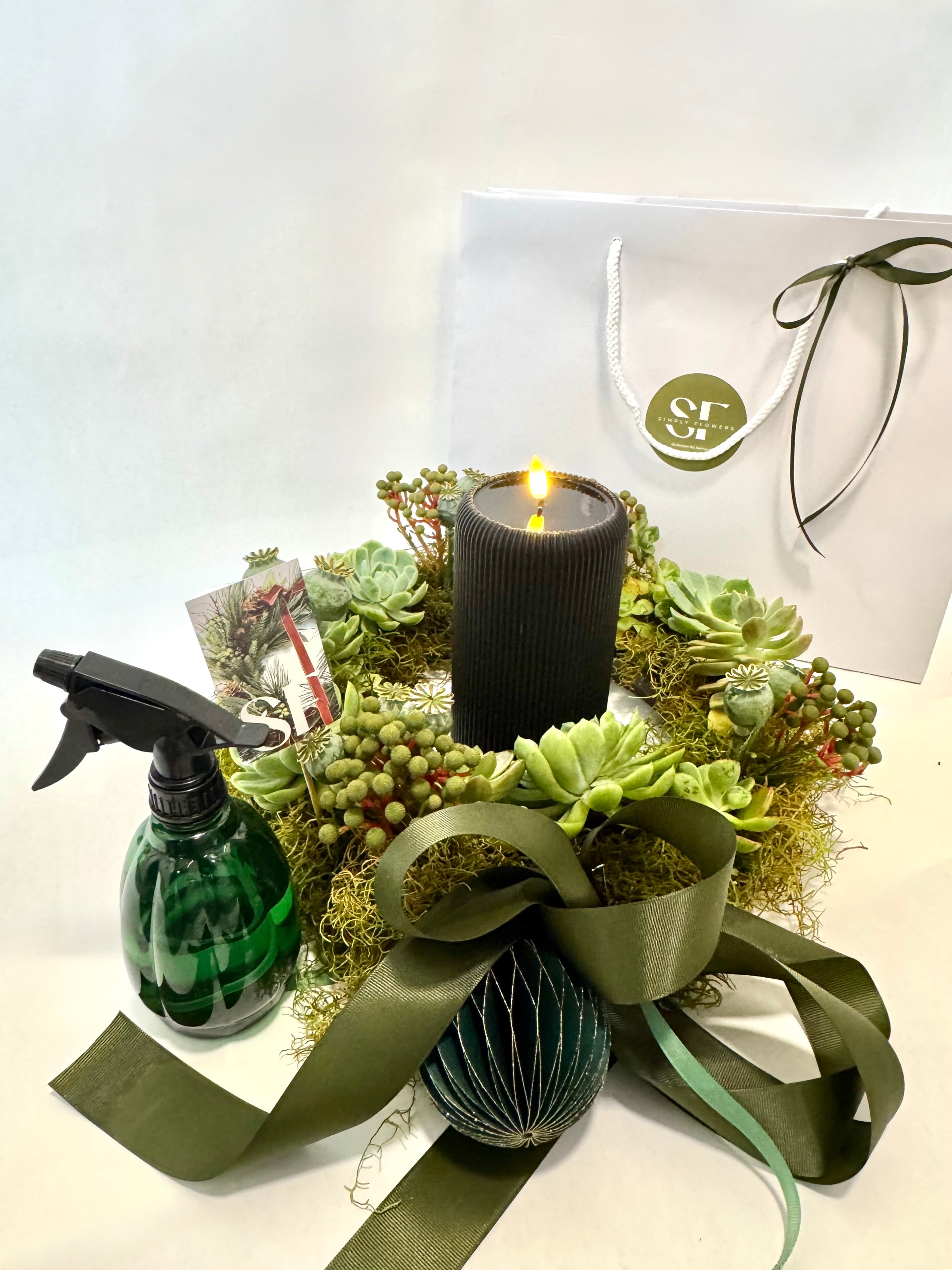 Celebrate the season with this stunning 60cm fresh wreath table arrangement, expertly crafted with vibrant succulents nestled in a moisture-retaining oasis circle. Its lush greenery and unique textures bring a natural, sophisticated charm to your holiday décor and comes with a mister spray bottle to maintain it.