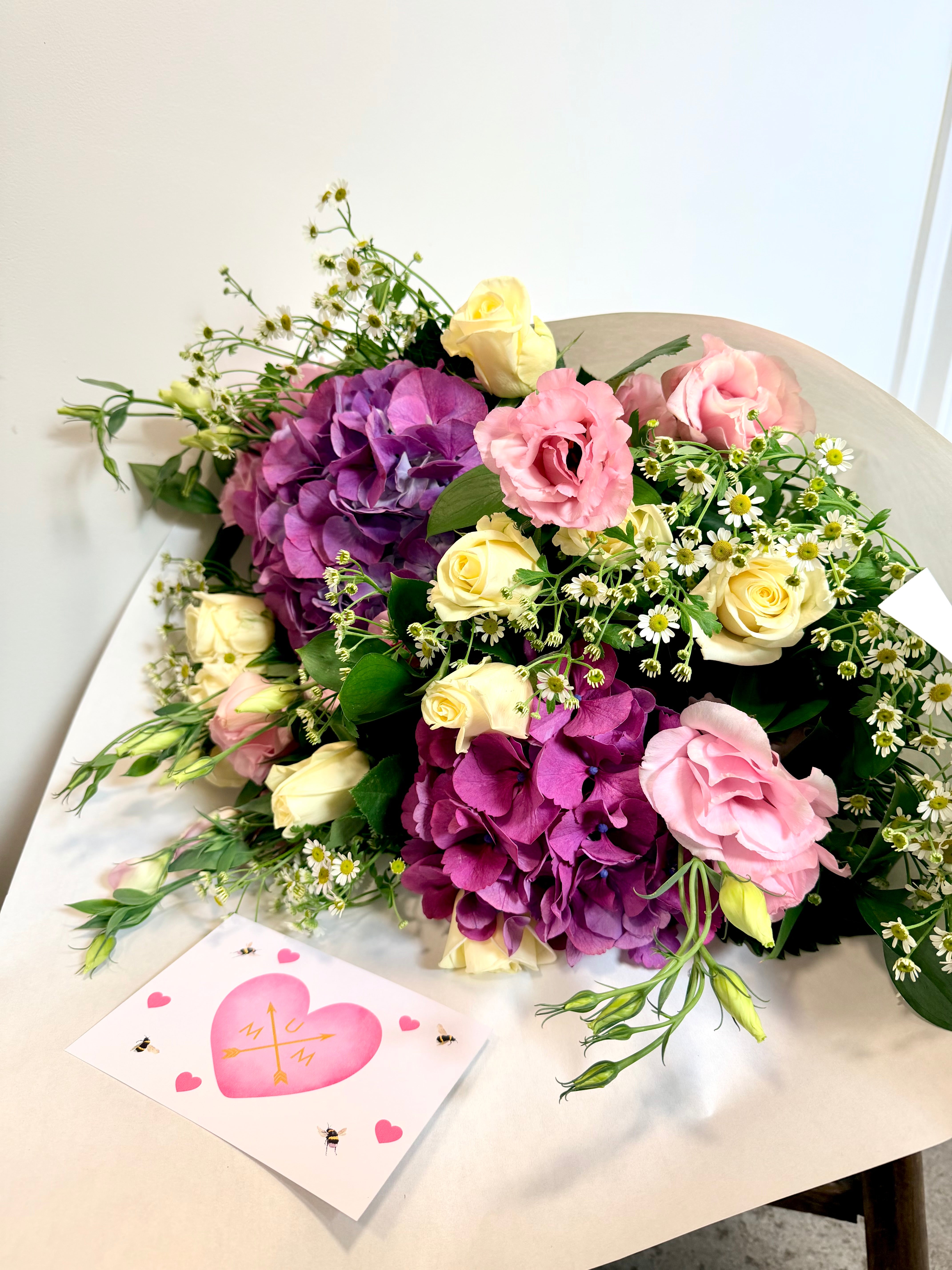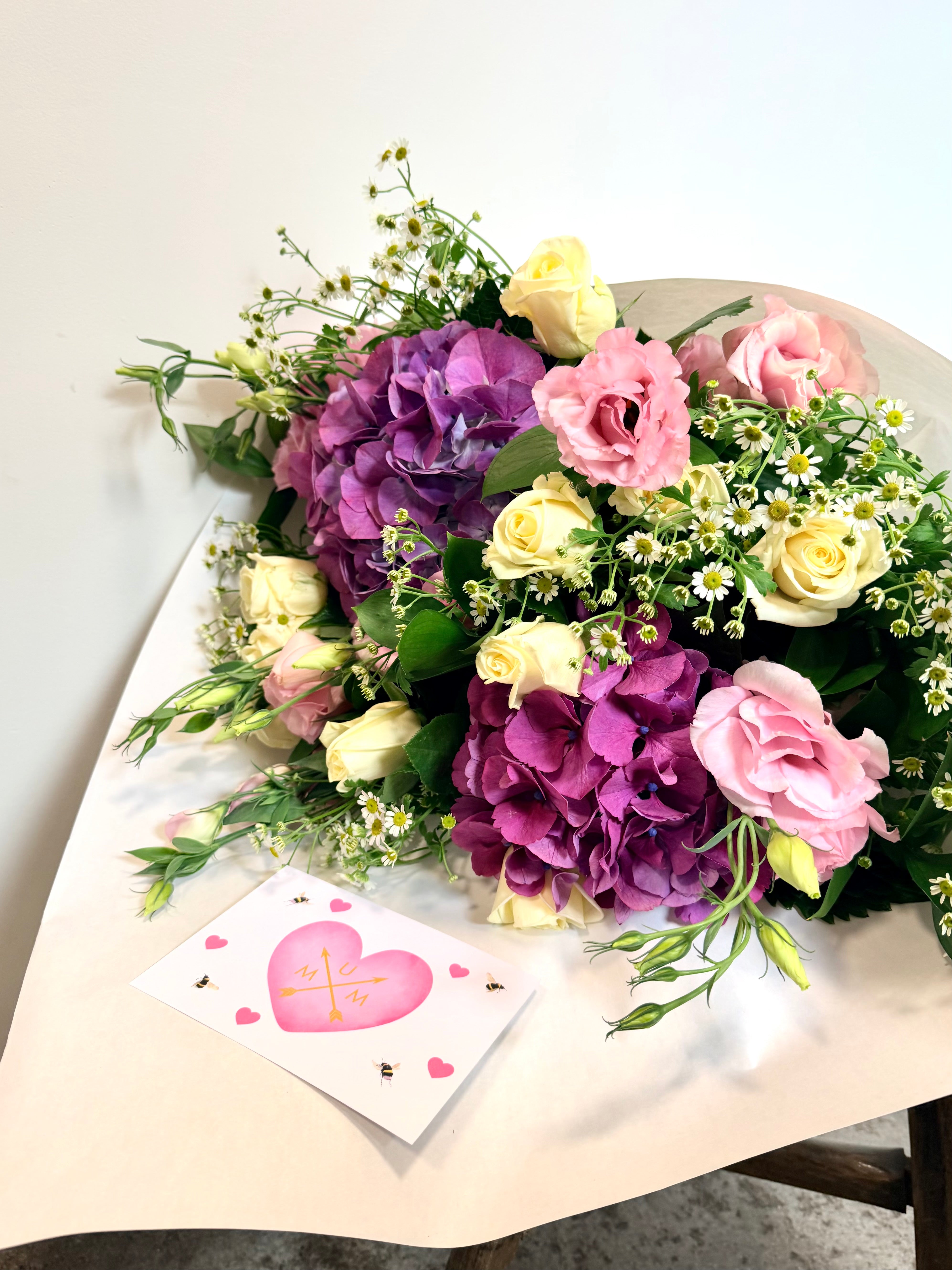 Our Mother’s Day Cheer Bouquet is a soft and elegant arrangement featuring purple hydrangeas, delicate matricaria, premium roses, and lisianthus. Thoughtfully arranged in seasonal tones, it is a beautiful way to celebrate Mum with flowers that feel both graceful and heartfelt.